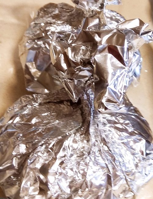 Sacamos los panecillos del horno y con cuidado de no quemarnos, retiramos el envoltorio. Colocamos en el plato y con la ayuda de la punta del cuchillo, hacemos un pequeño corte en la corteza del pan ( cuidado que quema y está crujiente) Ese corte lo hacemos para insertar la cabeza de becada, que es la mejor seña de identidad en el plato.