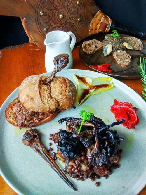 Cega amb cóc -becada en torta-, su pechuga a la plancha sobre camita de lentejas beluga con piña, trompetas de la muerte, tubis y su paté