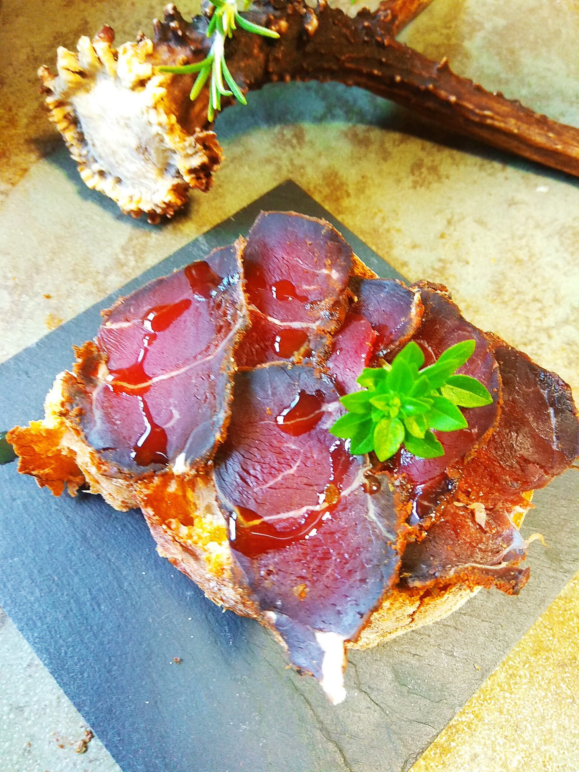 Tan básica como deliciosa, Cecina de corzo, curada en la nevera, pan y vino que es con lo que se anda el camino.