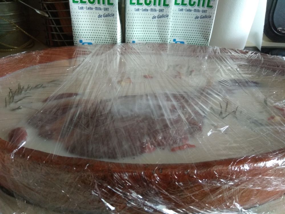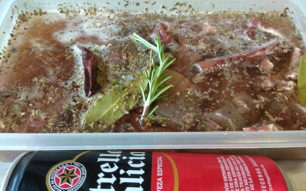- Marinados en líquidos de naturaleza ácida como el vino, la cerveza, el vinagre, el zumo de frutas, la leche, etc… Se caracteriza por sumergir la carne durante unas horas en el fluido con el triple objetivo de ablandar la carne, aclarar su color o no y que gane más aromas. Los líquidos suelen contener en suspensión mezclas de hierbas aromáticas, especias, verduras o frutas. Dependiendo de la receta que hayamos elegido para su cocinado, el propio líquido en el que se marida la carne puede pasar a formar parte también del proceso de cocinado posterior.