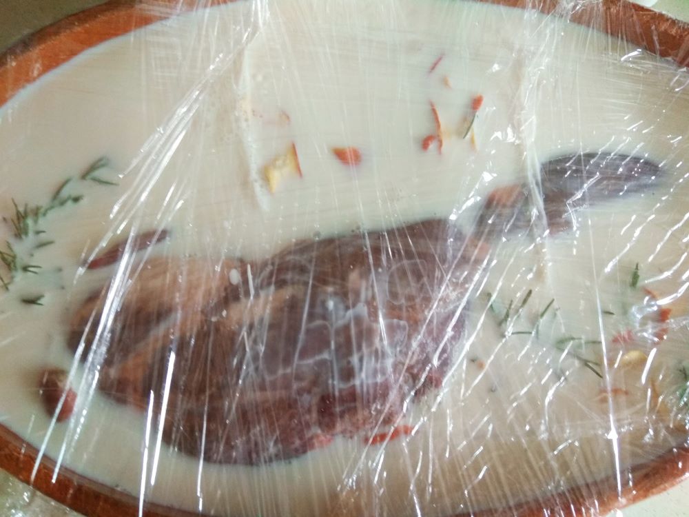 Se puede emplear cualquier tipo de leche, puesto que todas ellas son de ph ácido. Este líquido nos permite ablandar la carne pero sin aportar su sabor a ella. Los tiempos de inmersión pueden llegar y superar las 24 horas con carnes de animales viejos. También podemos infusionar en la leche la combinación de hierbas aromáticas o especias que deseemos. Éstas si que aportarán su aroma a la carne. Una vez terminado el proceso es importantísimo secar con un paño o papel absorbente la leche que pueda quedar adherida a la carne. Después pasaremos a cocinarla. Sin embargo es muy recomendable introducir un paso intermedio en el que se deje sumergida la carne unas horas en vino blanco de aguja o espumantes. Si empleamos vino tinto volveremos a oscurecer la carne, por lo que no es conveniente su uso para este caso concreto.