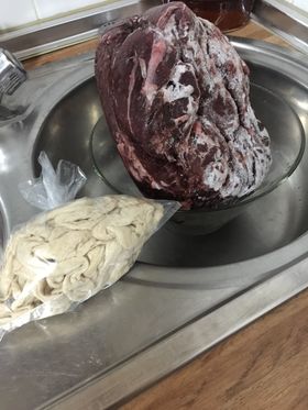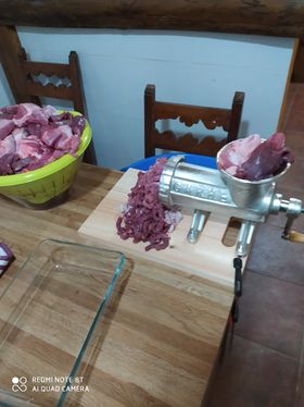 Antes de empezar, descongelamos la carne de jabalí que tenemos al aguardo en el congelador. Siempre en la nevera. Nuestro compañero nos enseña los momentos de las dos tandas de carne sin su envoltorio y ya descongeladas. Lavaremos las tripas y dejaremos escurrir hasta el momento en que nos hagan falta.