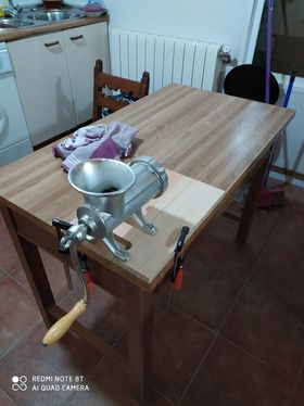 Procedemos a picar la carne, este es el momento más bonito, con esa picadora manual, a manivela que seguramente hace las delicias de los más pequeños en casa. Si tienes picadora de carne eléctrica, también vale, pero esta como solemos decir es la más ecológica que existe,