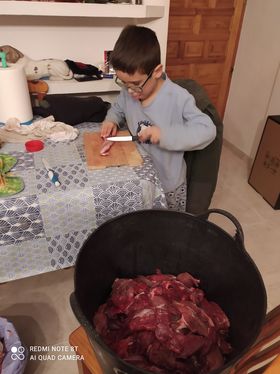 Otro momento divertido, para los más peques…Manos lavadas y a mezclar la masa de los chorizos de jabalí.