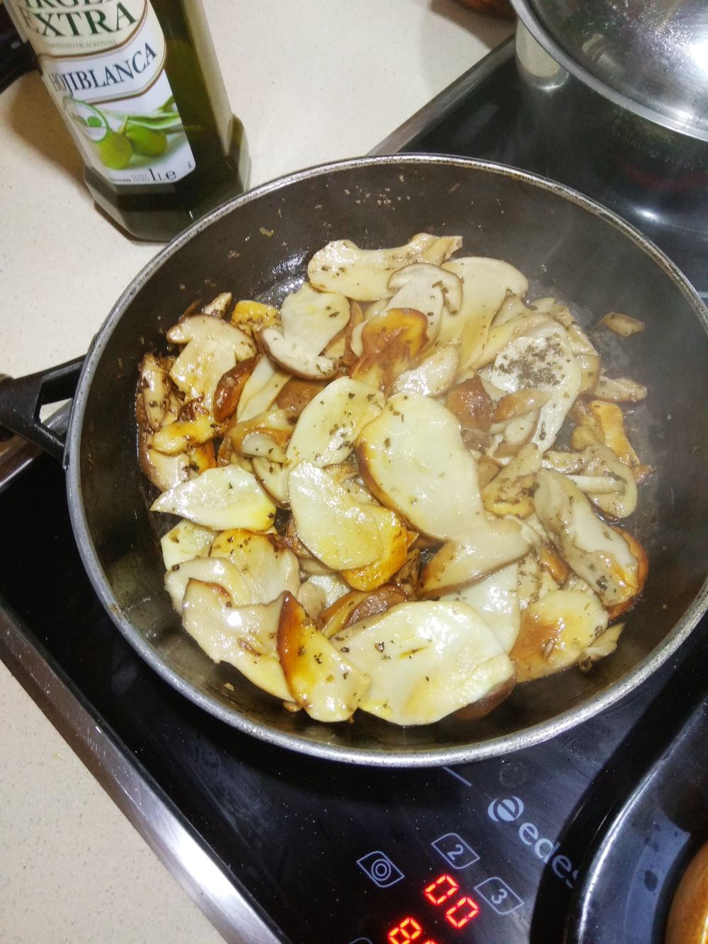 En la misma sartén y en ese mismo aceite, laminamos y doramos los dientes de ajo que tenemos reservados y la guindilla cayena, cuando cojan un bonito color dorado, añadimos los boletus laminados (o setas de cultivo) movemos y dejamos que se hagan.