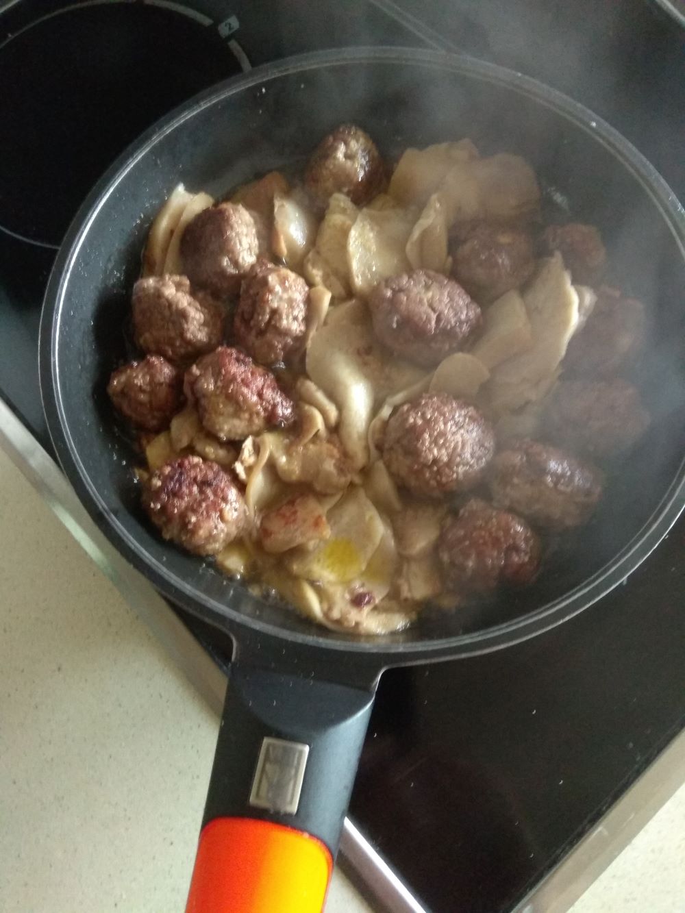 Una vez que veamos que las setas están casi hechas, (+ – 5 minutos) añadimos las albóndigas de corzo y dejamos al fuego dos o tres minutos minutos (Si hiciste las bolas grandes, tendrás que dejarlas un poquito más para que estén bien hechas en el interior.)