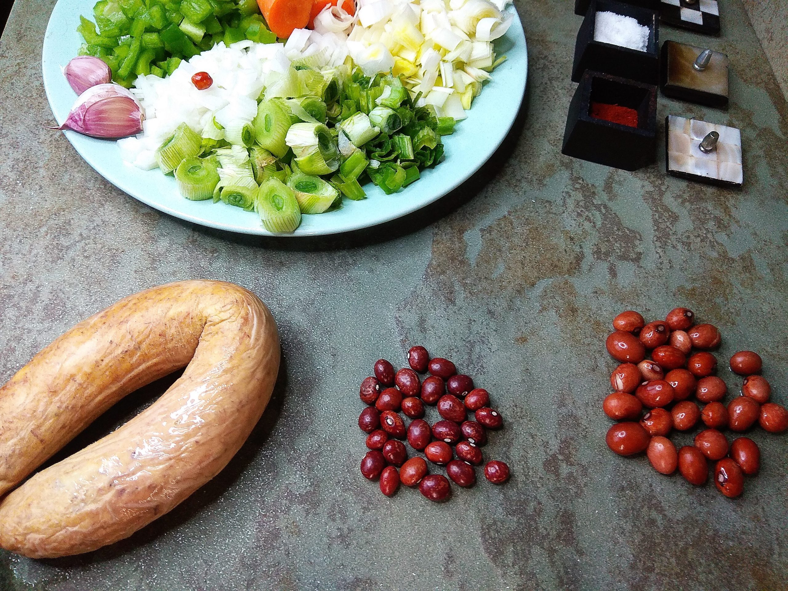 La noche anterior se pone la alubia pinta a remojo, no es necesario poner sal ni bicarbonato, solo que estén bien cubiertas, «engordan» al hidratarse, con lo que si no tienen al menos tres dedos más de agua (sobre la legumbre), no se hidratarán bien.