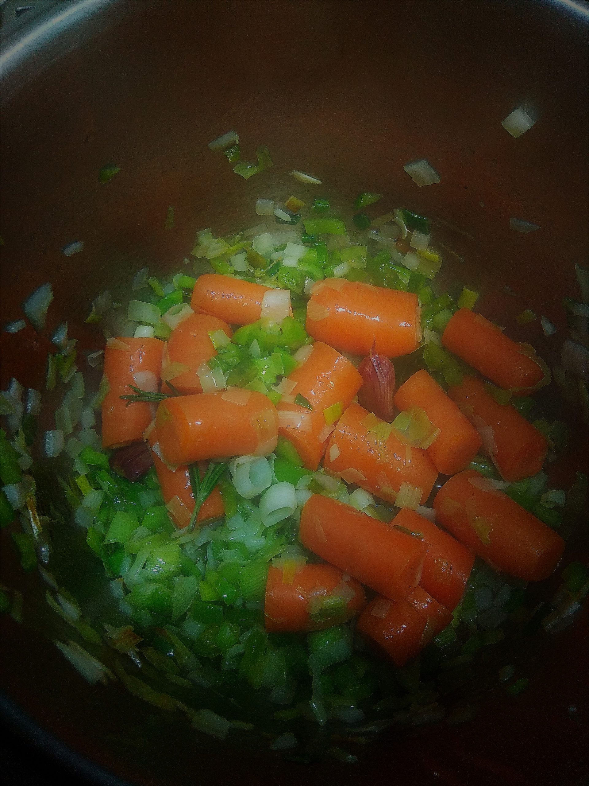 Pochamos la verdura y añadimos los dientes de ajo, la hoja de laurel, los boletus hidratados, las zanahorias peladas y cortadas en trozos generosos, un poquito de orégano y los granos de comino en entero ( poquitos, 4 o 5) dan mucho sabor y en este plato son más para evitar los gases de la legumbre, así que si no te gusta el sabor del comino…No se lo pongas.