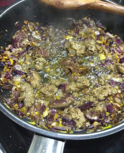 En esa misma sartén doramos la chalota y la media cebolla roja, cortada en brunise ( cuadraditos lo más fino posible). Cuando estén las cebollas transparentes, añadimos las tripas de la becada. Doramos unos 4 o 5 minutos. Añadimos el foie, dejamos que se incorpore con el conjunto, salpimentamos al gusto y mojamos con el whisky o si prefieres un sabor especial, con un toque diferente, añade un buen anís. Dejamos que reduzca el alcohol y pasamos la mezcla por un robot o batidora de brazo. Reservamos.