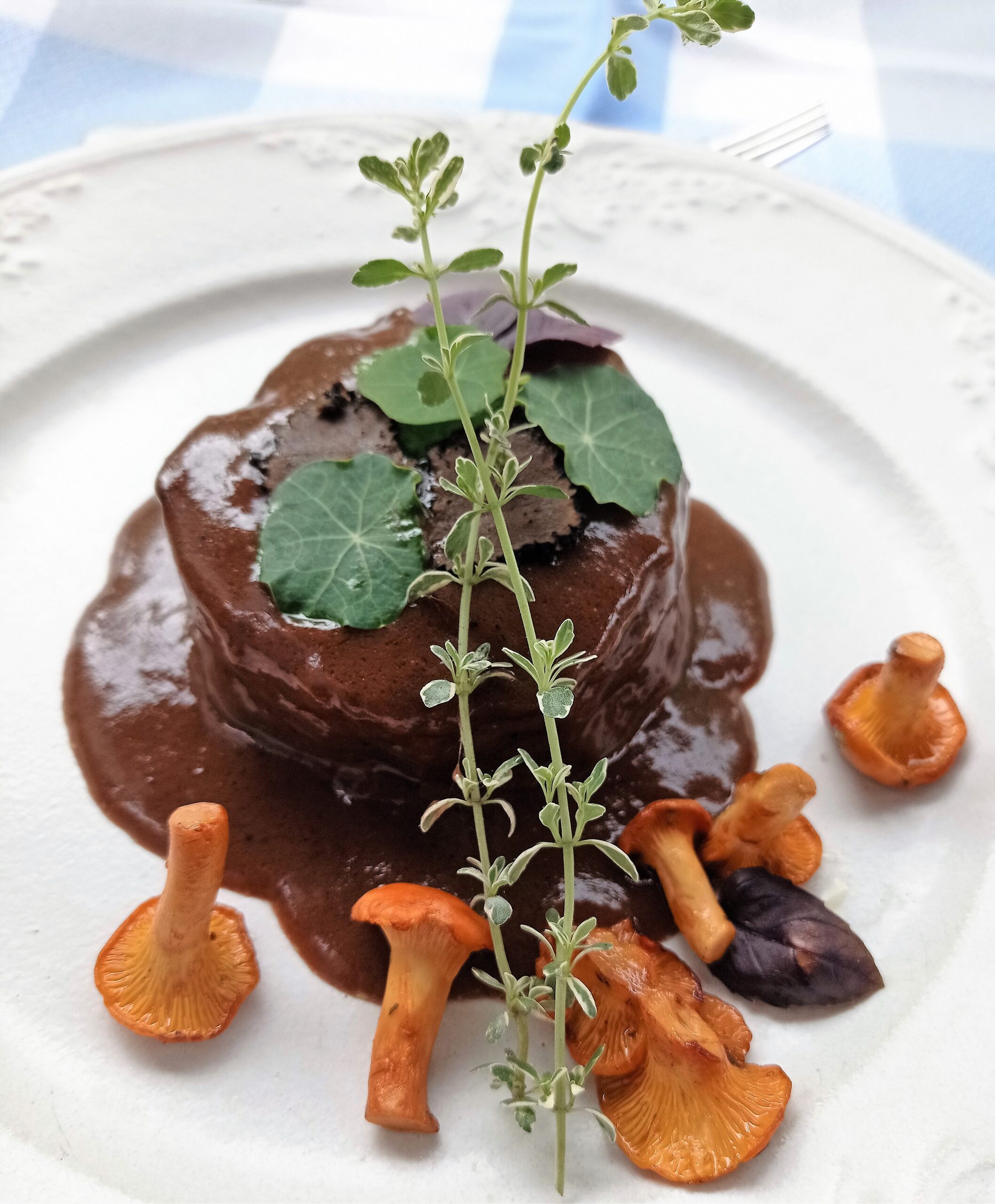Retiramos la malla y el papel film, con el rollo frío y con un cuchillo cortamos medallones de dos dedos de grosor. Podemos calentar los platos mientras calentamos la salsa, para que el conejo esté atemperado. Napamos con la salsa y decoramos con tomillo, romero, orégano fresco, albahaca morada o con las hierbas o flores comestibles que más te gusten. Salteamos unas setas silvestres, que nos servirán de guarnición. Un plato vistoso y más sencillo de lo que parece. Ideal para celebraciones o simplemente para degustar esta carne de caza de una forma diferente.