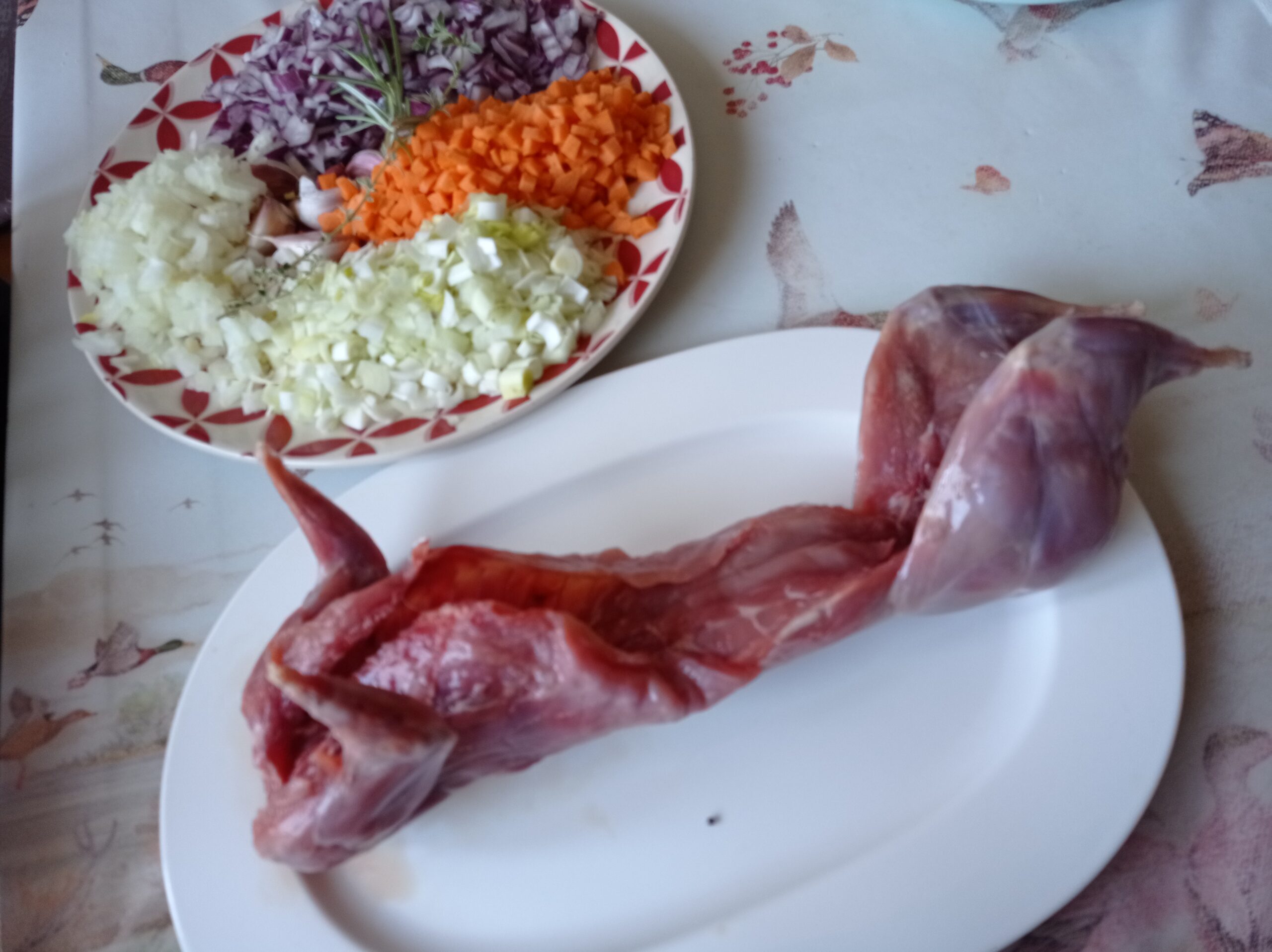 En un bol colocamos la carne de corzo picada ( al despiezar la pierna, obtenemos varias piezas deliciosas, una de ellas es la babilla, una pieza redondeada, muy tierna y con muchos usos) Salpimentamos, añadimos la miga de pan escurrida y anteriormente humedecida en un poco de leche, la clara de huevo, un chorrito de vino fino o de O’porto. Y con esa farsa cubrimos la carne del conejo en su totalidad.