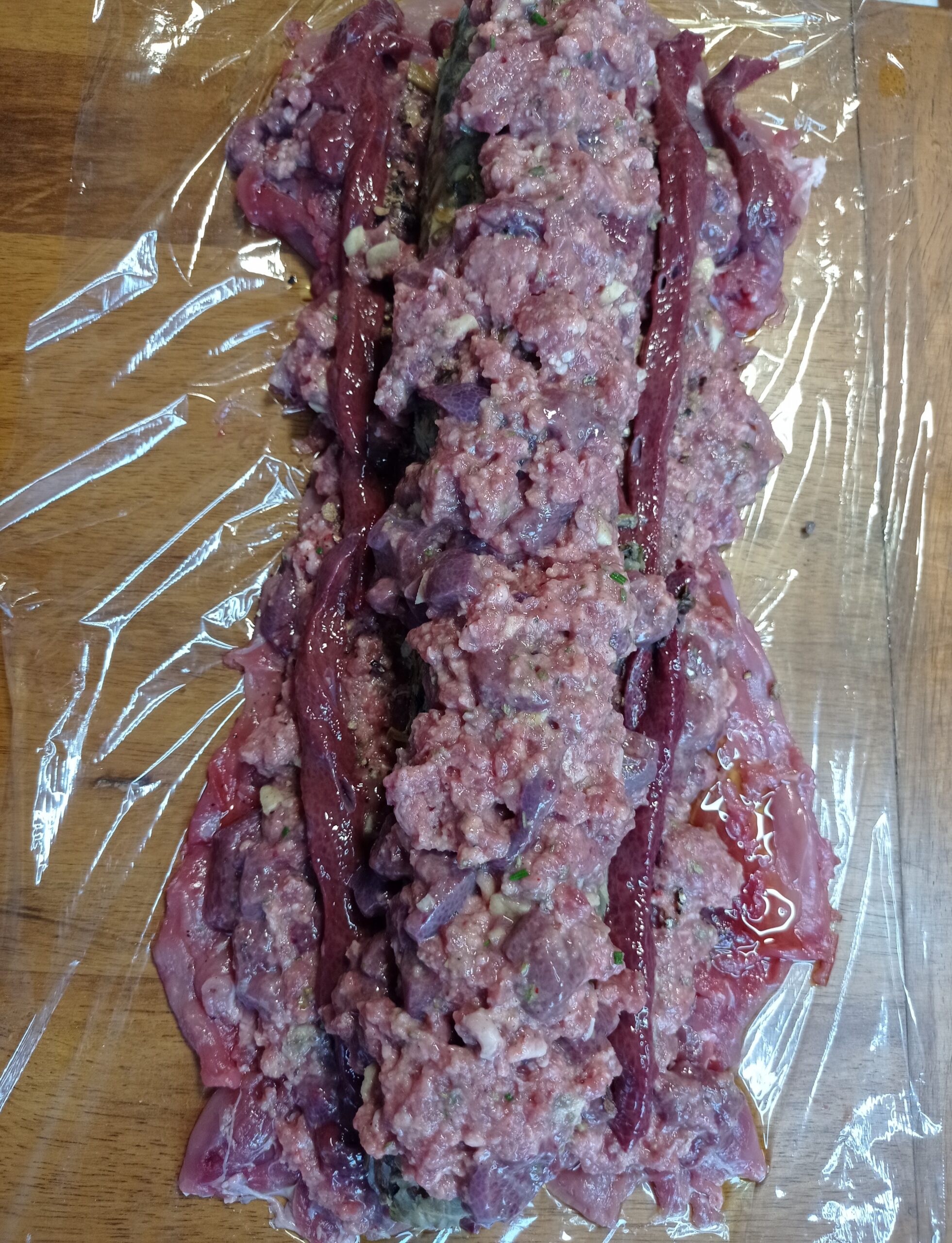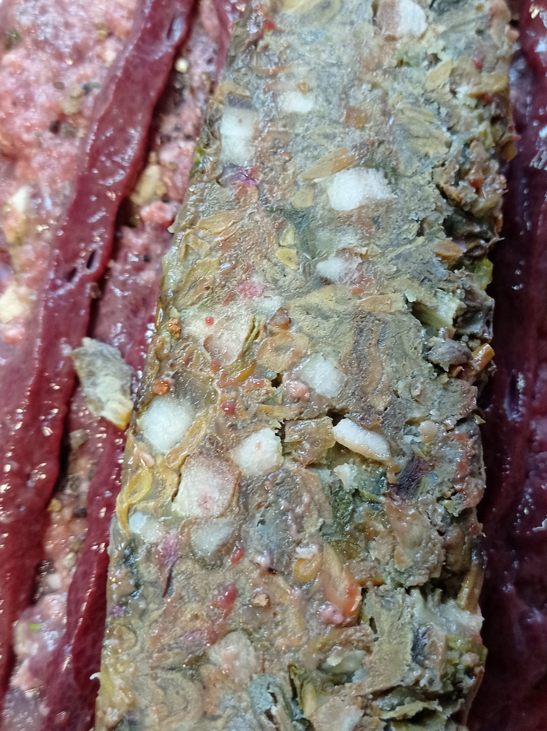 En un mortero majamos 6 bayas de enebro y 10 bolas de pimienta negra y se lo añadimos sobre la carne picada, unas tiras de hígado de cerdo ( este paso es opcional, queda muy rico, pero si no te gusta, puedes poner otra cosa o no poner nada) Sacamos el rollo de las setas que tenemos congelado, quitamos el papel film y colocamos sobre el relleno.