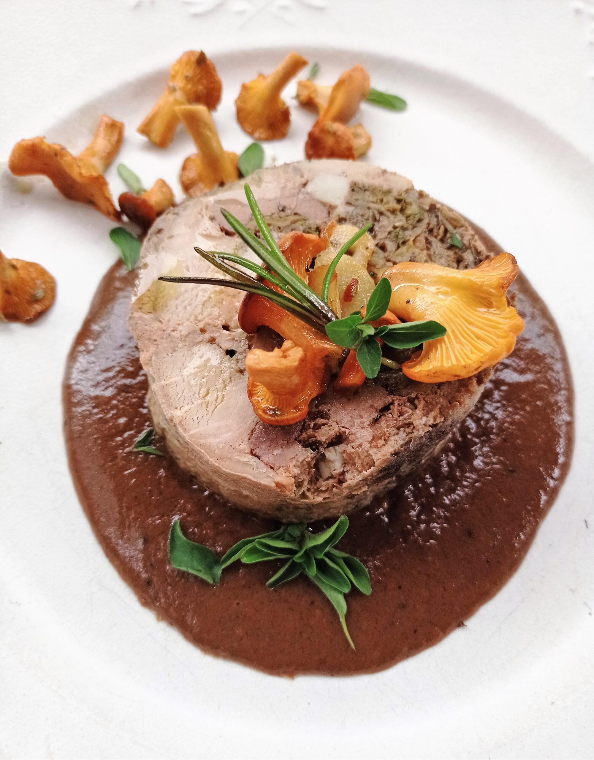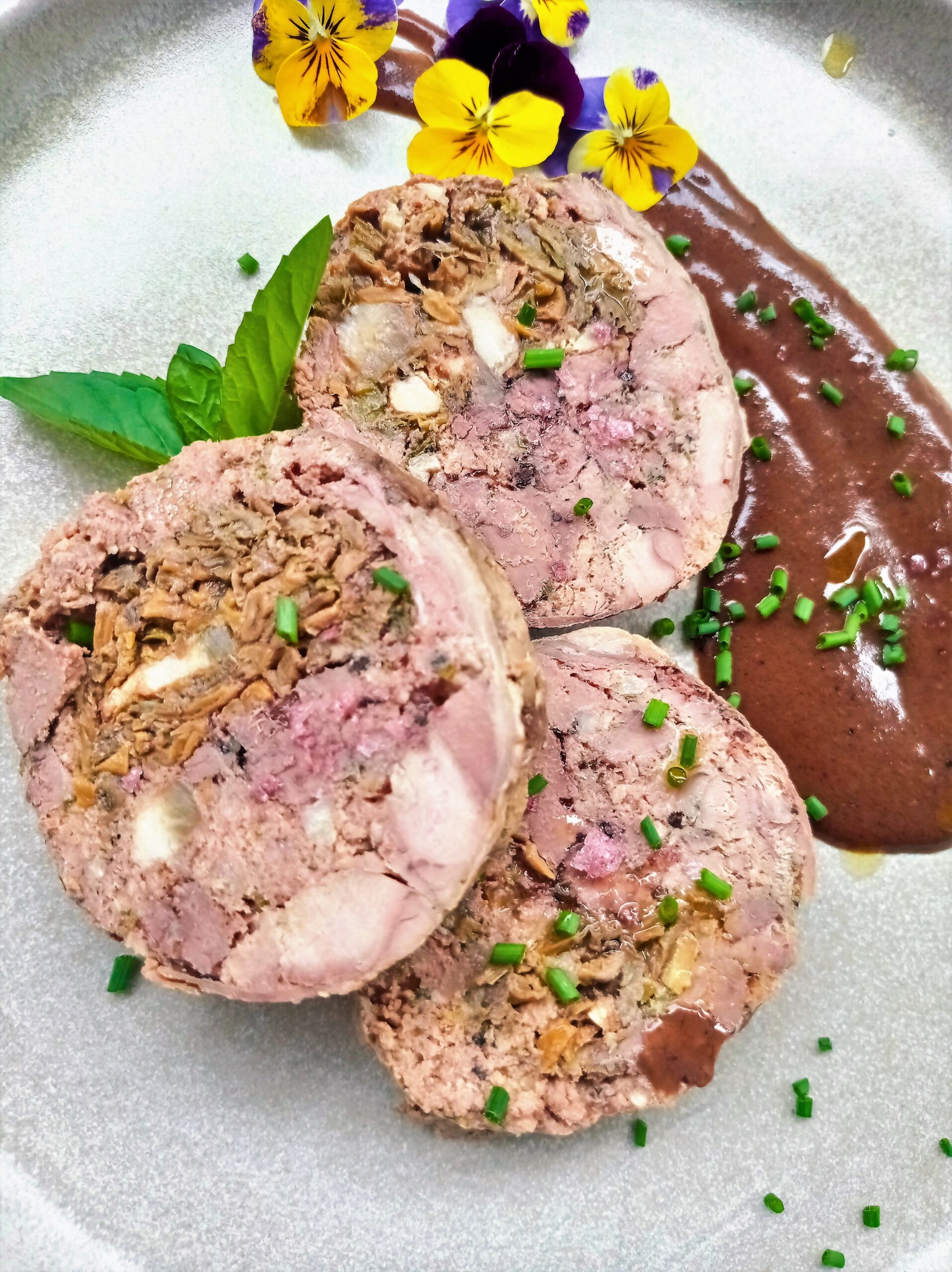 Esta receta de Conejo de monte con muy buen rollo o (Rulo de conejo de monte con corzo, Craterellus tubaeformis, vino tinto y cacao) te va a encantar.