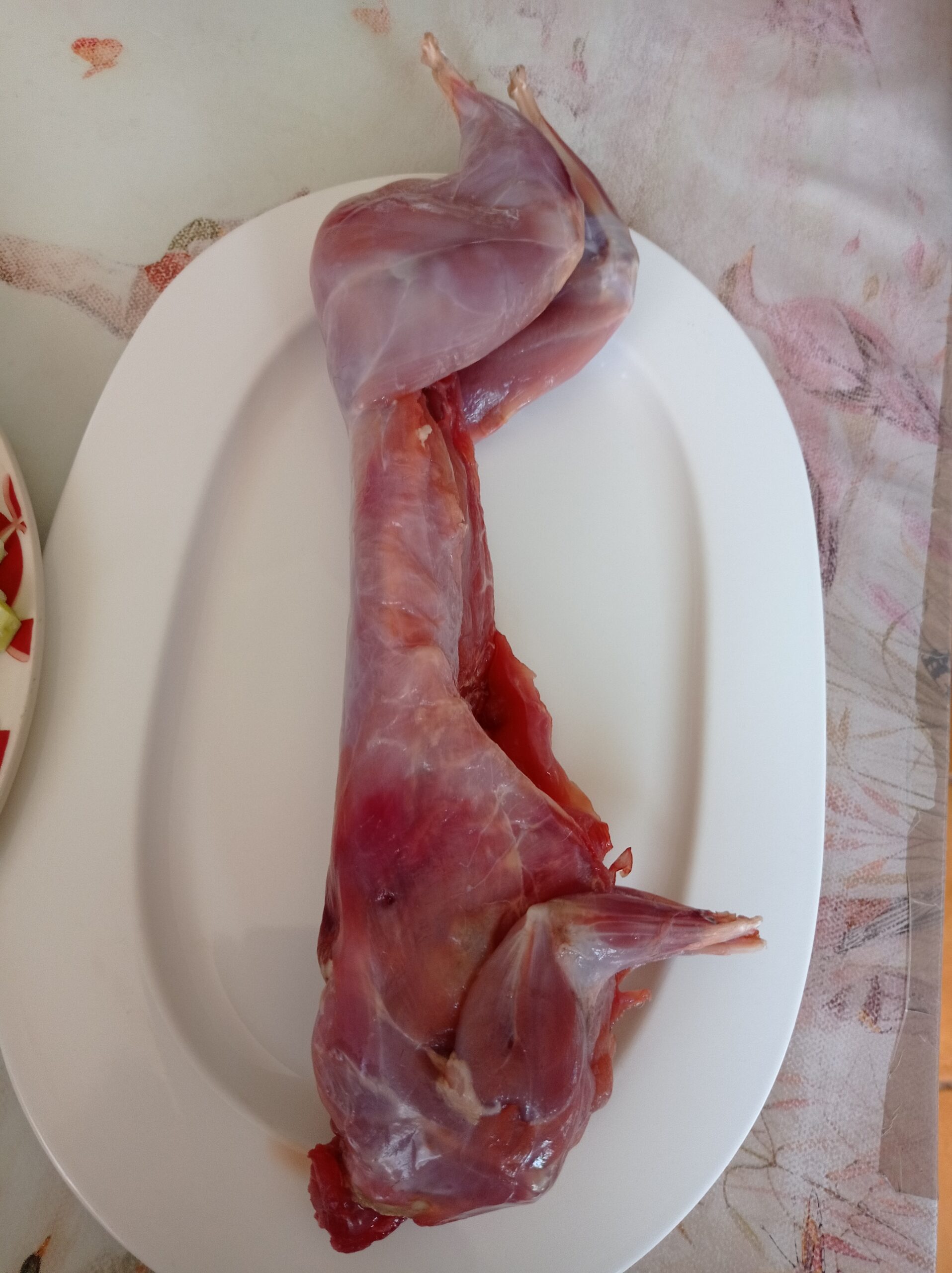 Comenzamos cazando el conejo ( bromas aparte). Colocamos la pieza sobre la tabla, con las costillas hacia arriba, y con la ayuda de un cuchillo pequeño y bien afilado, comenzamos cortando la carne que cubre las costillas, poco a poco, vamos dejando al lado la carne de los huesos.