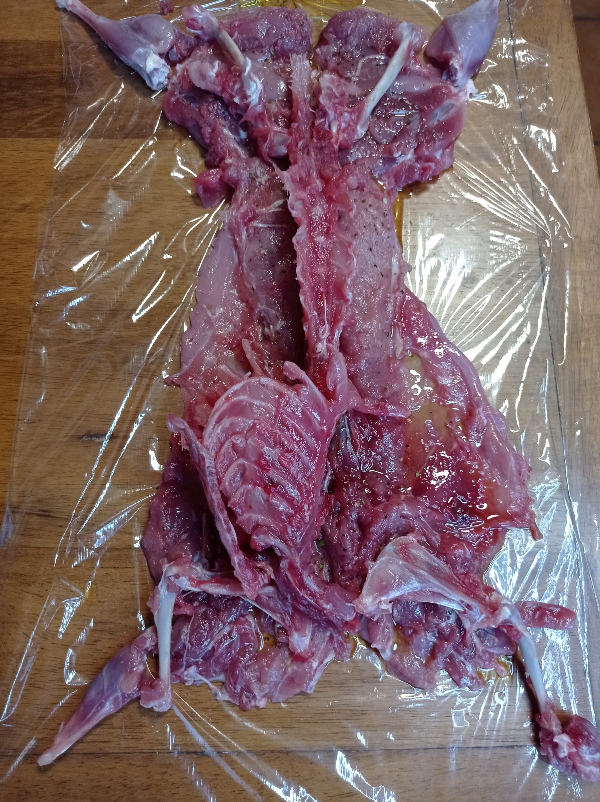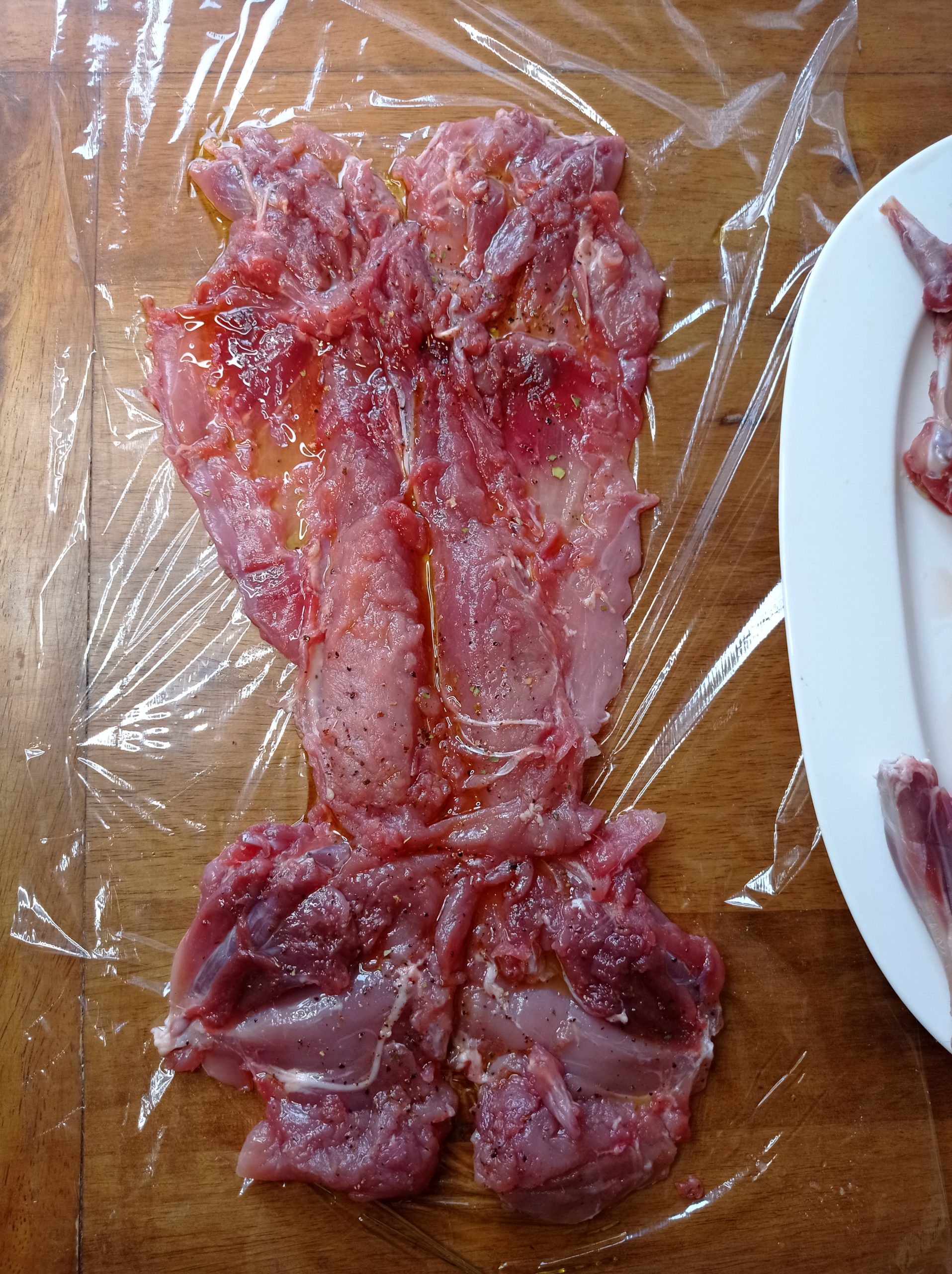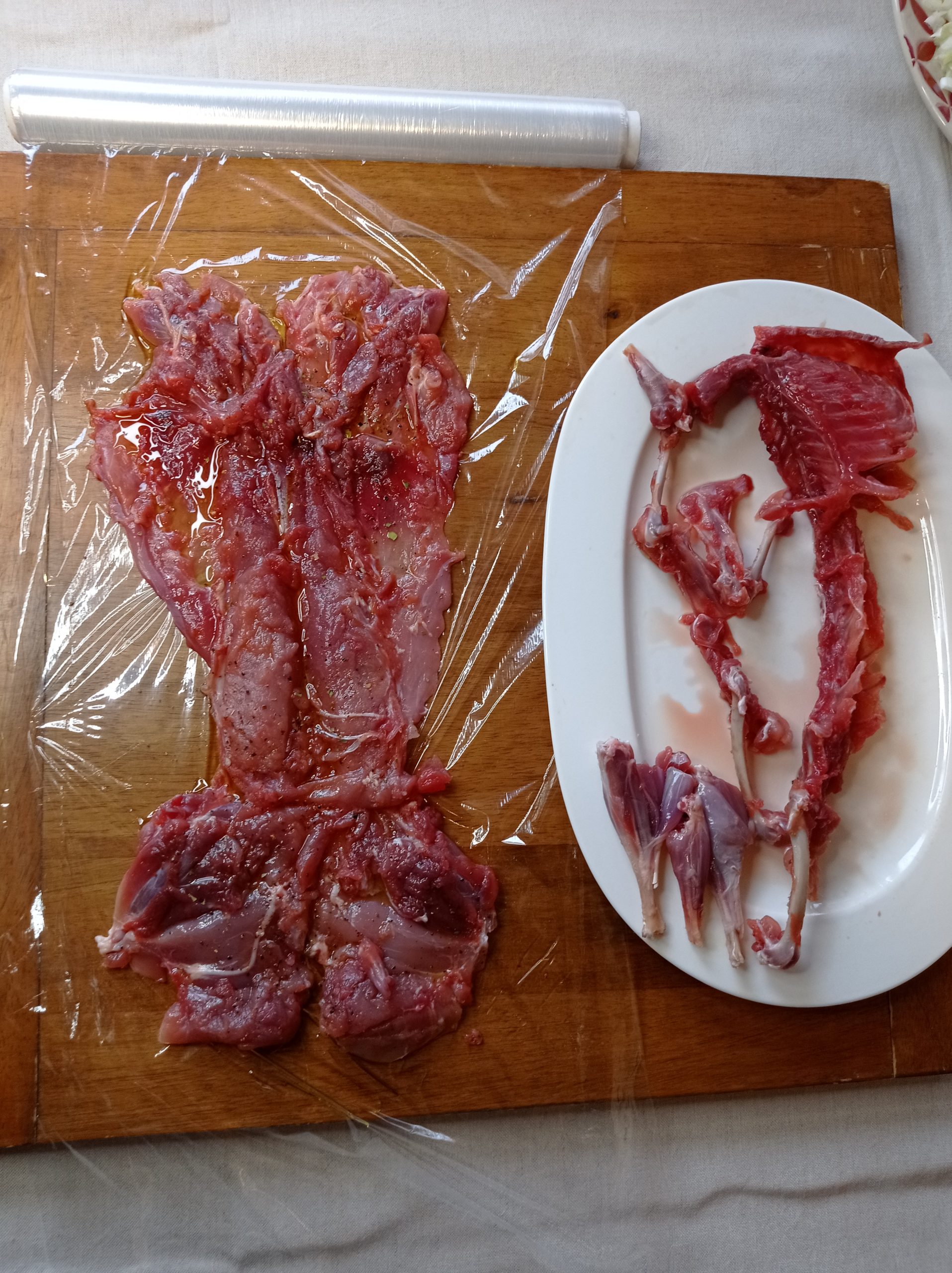 Vamos con la carne de las paletillas y de las patas. Cortamos la carne a lo lardo del muslo, raspando con la punta del cuchillo el hueso dejándolo limpio, hasta llegar a la articulación, que cortaremos con un golpe seco. Las paletillas llevan el mismo proceso. Una vez deshuesado, limpiamos concienzudamente la tabla de trabajo y extendemos el conejo sobre papel film, untamos la carne con un chorrito de aceite de oliva.