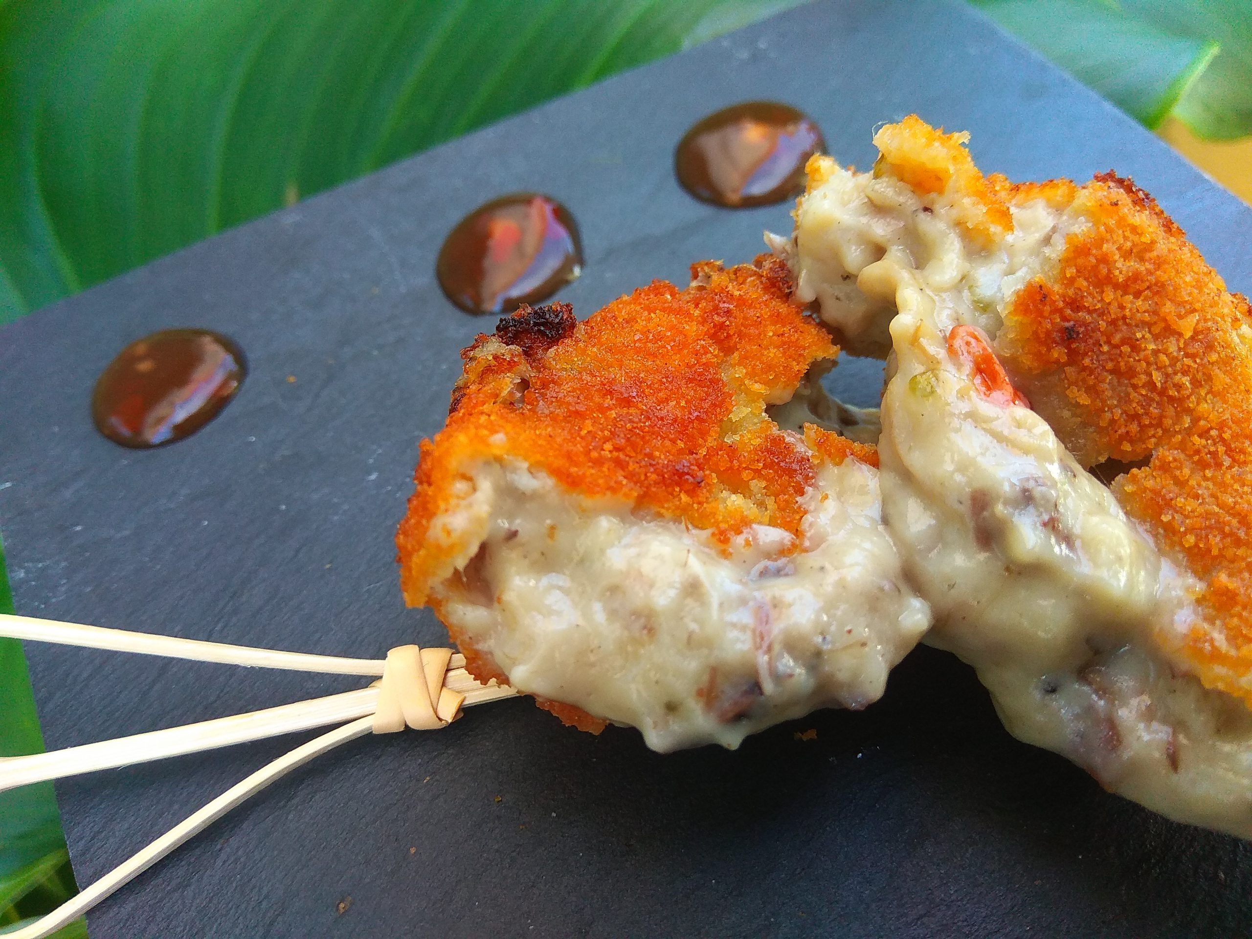 Finalizamos pasando las croquetas ( puedes jugar con las formas, hacerlas redondas o reservar un poco de farsa para rellenar unos pimientos del piquillo) por harina, huevo batido y pan rallado y a la sartén.