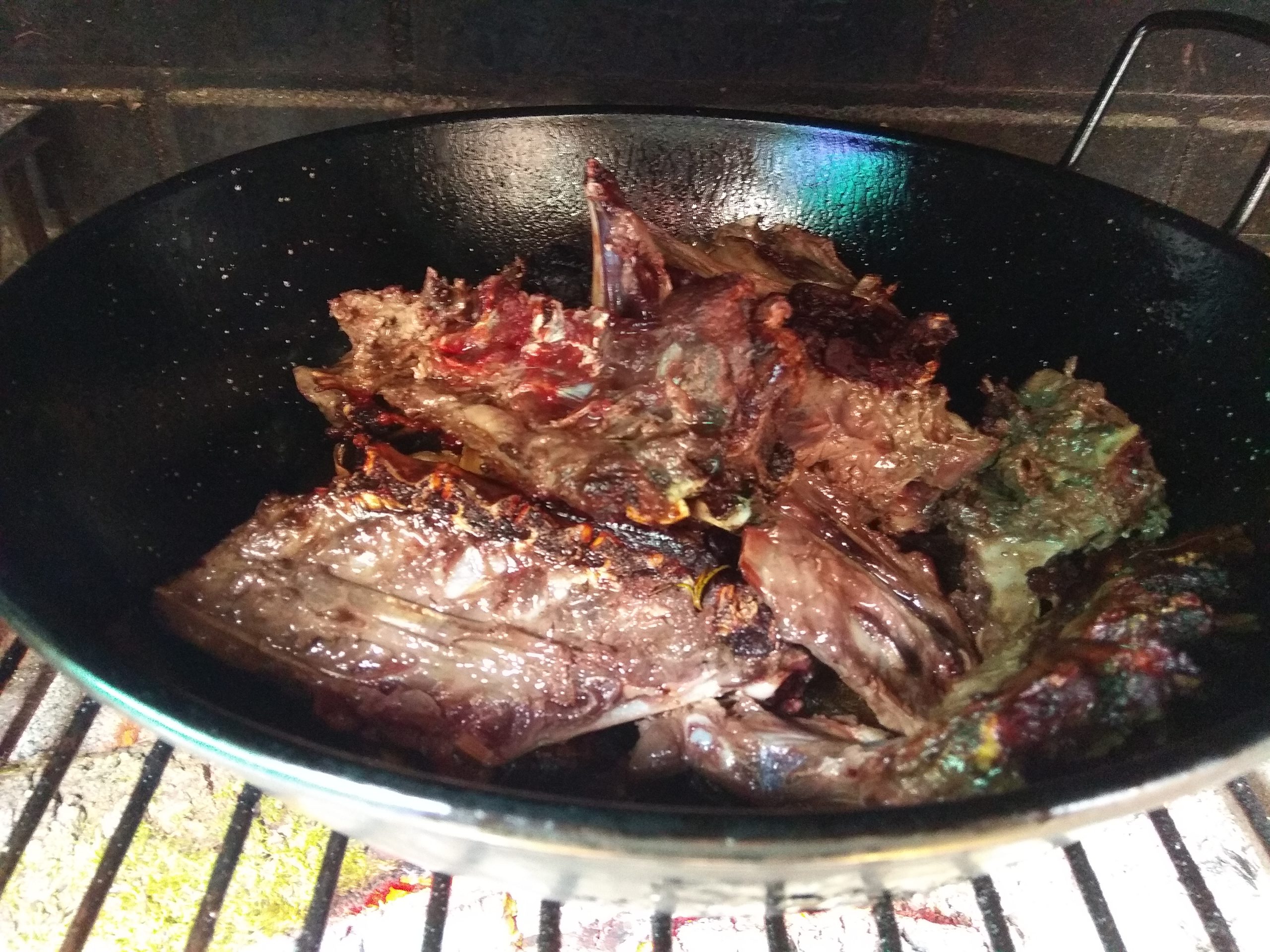 Hay que mantener el fuego una hora y media, pasado este tiempo dejaremos que vaya a su ritmo sobre las brasas. Vigilando de que no nos quede el guiso sin caldo. Retiramos y dejamos enfriar para desmenuzar la carne. El caldo se reserva, es dónde está toda la sustancia.