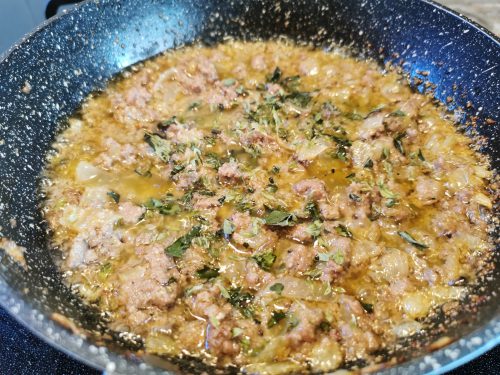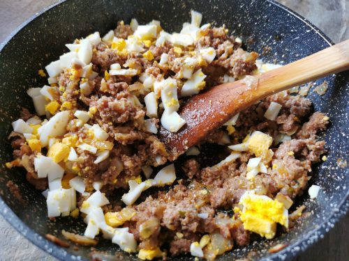 Picamos carne de caza con jamón serrano, ajo, un huevo, pan mojado en leche, cebolla, pimienta, orégano, una pizca de clavo y canela.