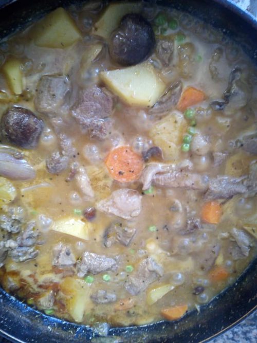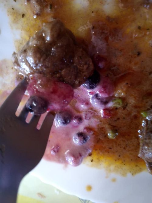 Estofado de jabalí con setas con acompañamiento de salsa ácida de frutos del bosque