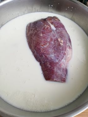Descongelar la carne en leche. Por qué en leche, porque la leche al contener ácido láctico es uno de los mejores líquidos para ablandar, sin perder jugosidad en la carne,  también para aclarar ( en el caso en el que nuestros comensales no tengan hábito o puedan tener reticencias a comer un guiso de carne oscuro) y sobre todo porque la leche no le aporta sabor. La pieza en esta ocasión está con hueso, al guiso le aportará sabor, pero se puede hacer con la carne de jabalí deshuesada y cortada en trozos para guisar. Tapamos la cazuela o fuente con papel film, y la dejamos 24 horas dentro de la nevera.