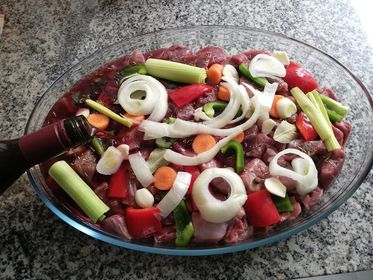 Luego la ponemos a marinar con vino tinto, ( o blanco. El vino debe ser el que esté bueno en copa) junto con unas verduras y especias otras 24 horas, tapando la fuente y  dentro del frigorífico. Después de eso, escurrimos la carne, la secamos bien y la dejamos escurrir.