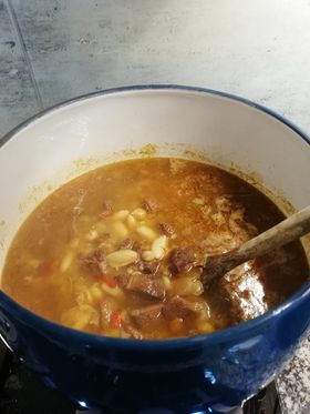 Salpimentamos la carne y doramos en aceite bien caliente en nuestra preciosa POTA de las de siempre, marcamos bien  la carne y la reservamos, en ese mismo aceite pochamos las verduras, la  cebolla, el pimiento rojo, el verde, tres ajos, las zanahorias y el puerro, todo picado fino con romero, tomillo y laurel. Una vez esta bien pochado añadimos la carne y el jugo que ha soltado. En cuanto calienta la carne (coge temperatura y empieza a bailar dentro de la cazuela) añadimos un generoso vaso de vino blanco y dejamos evaporar el alcohol, después otro generoso chorro de brandy y volvemos a esperar que evapore, por último añadimos agua y a cocer unas dos y media o tres horas a fuego bajo, olla rápida 40 minutos +-, rectificar de sal e ir añadiendo agua si lo pide.