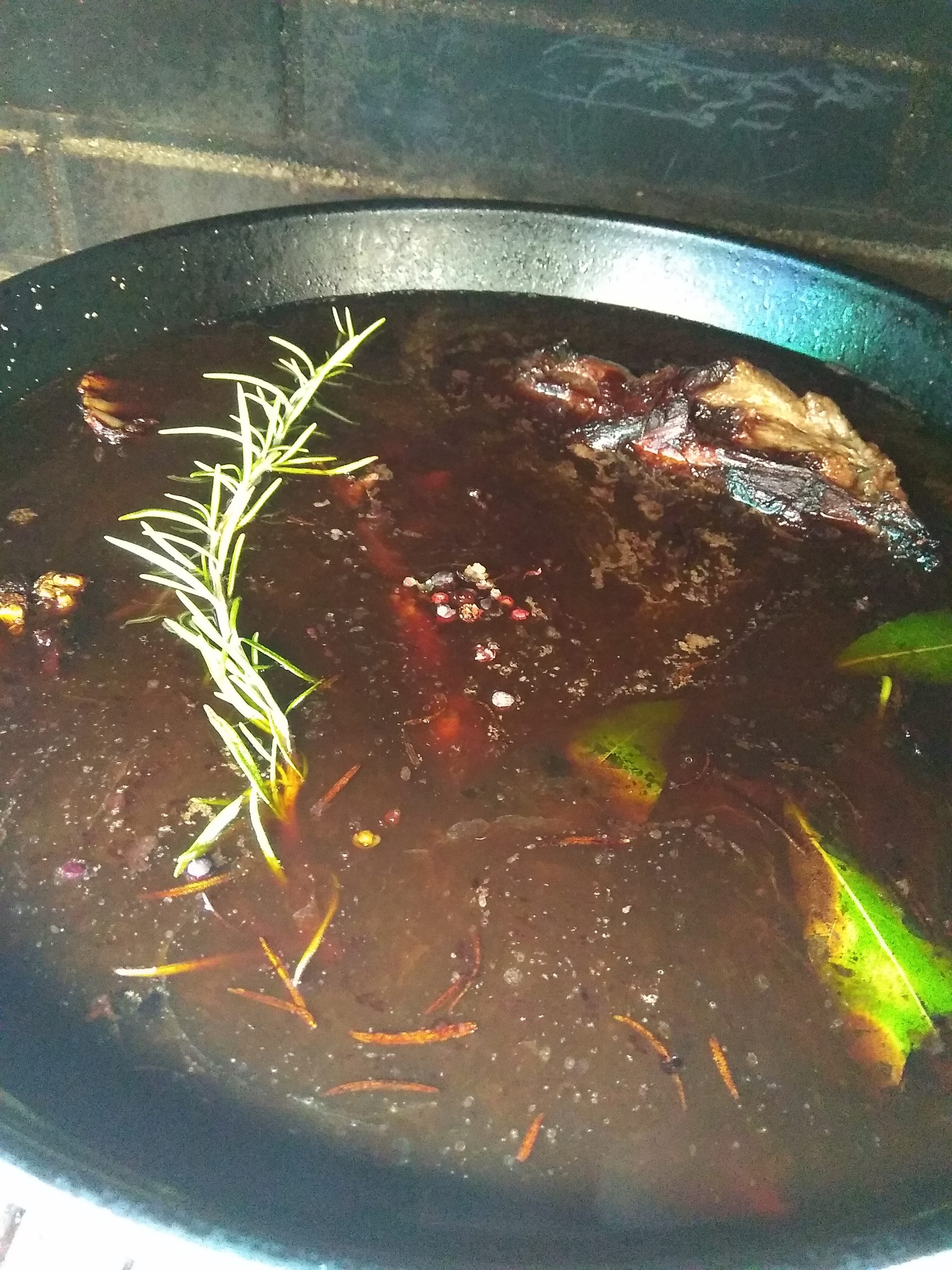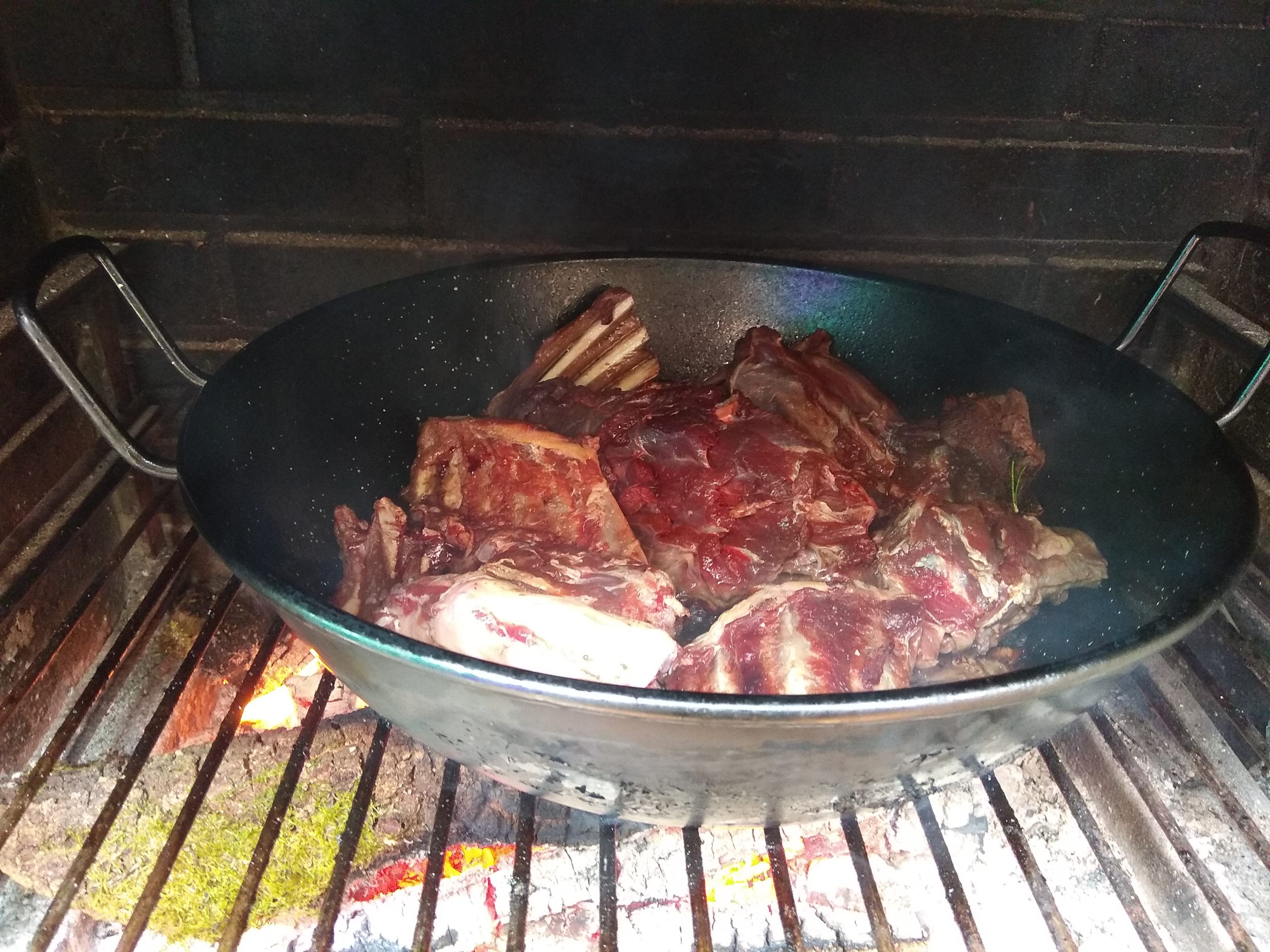Cubrimos, con el líquido toda la carne, si con el vino no lo hemos conseguido, añade agua ( si pones una cazuela con agua, en la parrilla, se calienta y no cortamos la cocción. Igual que hacemos con la leña, para no quedarnos con el fuego bajo)