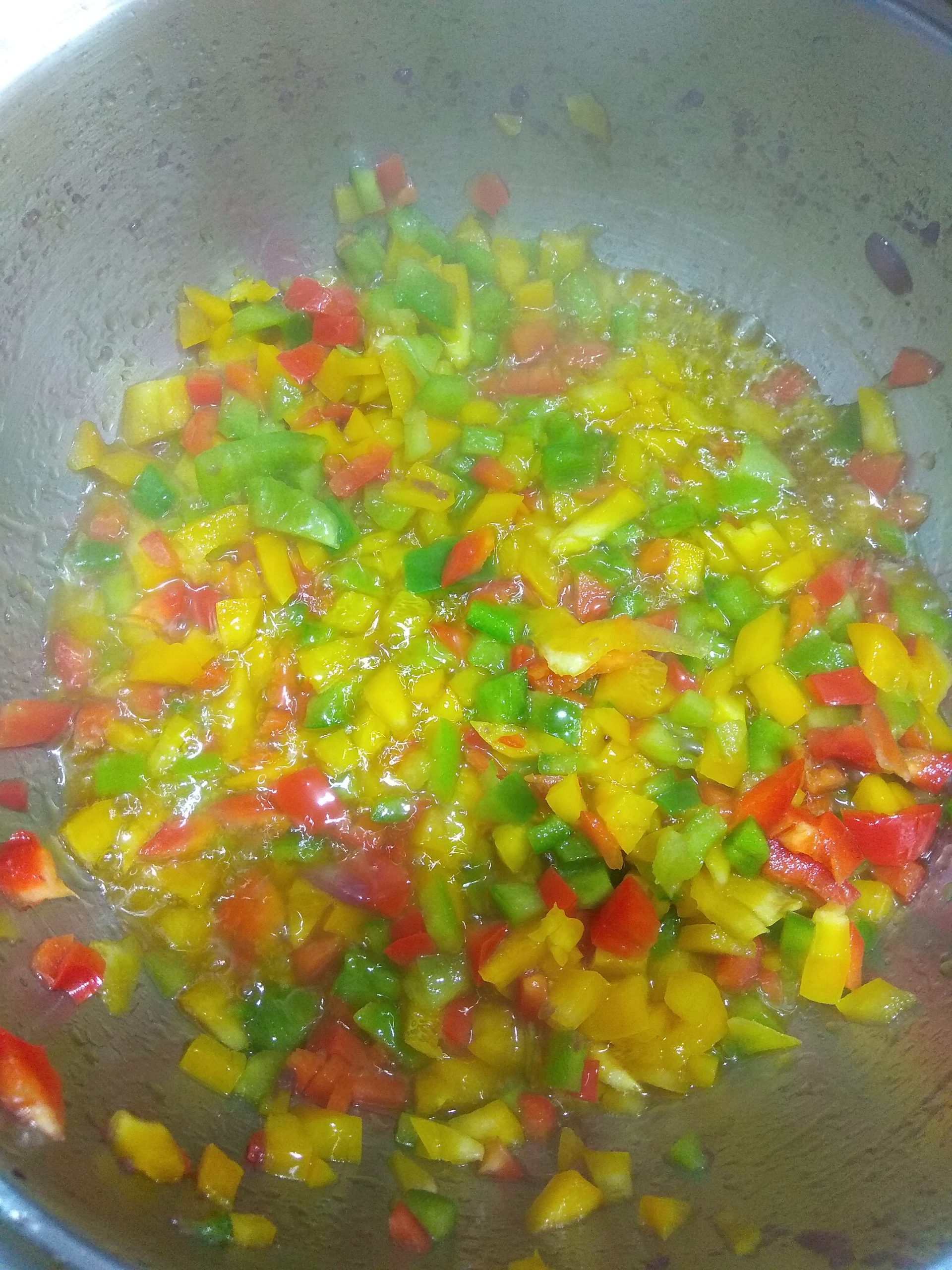 Comenzamos pelando y cortando las cebollas en juliana y los ajos en láminas, ponemos en una cazuela a fuego medio para que se pochen, en primer lugar los ajos y en un minuto las cebollas, no las queremos con mucho color. Picamos en cuadraditos o como más te guste un trozo de cada de los tres pimientos. Si no tienes a mano, el pimiento que más te guste.