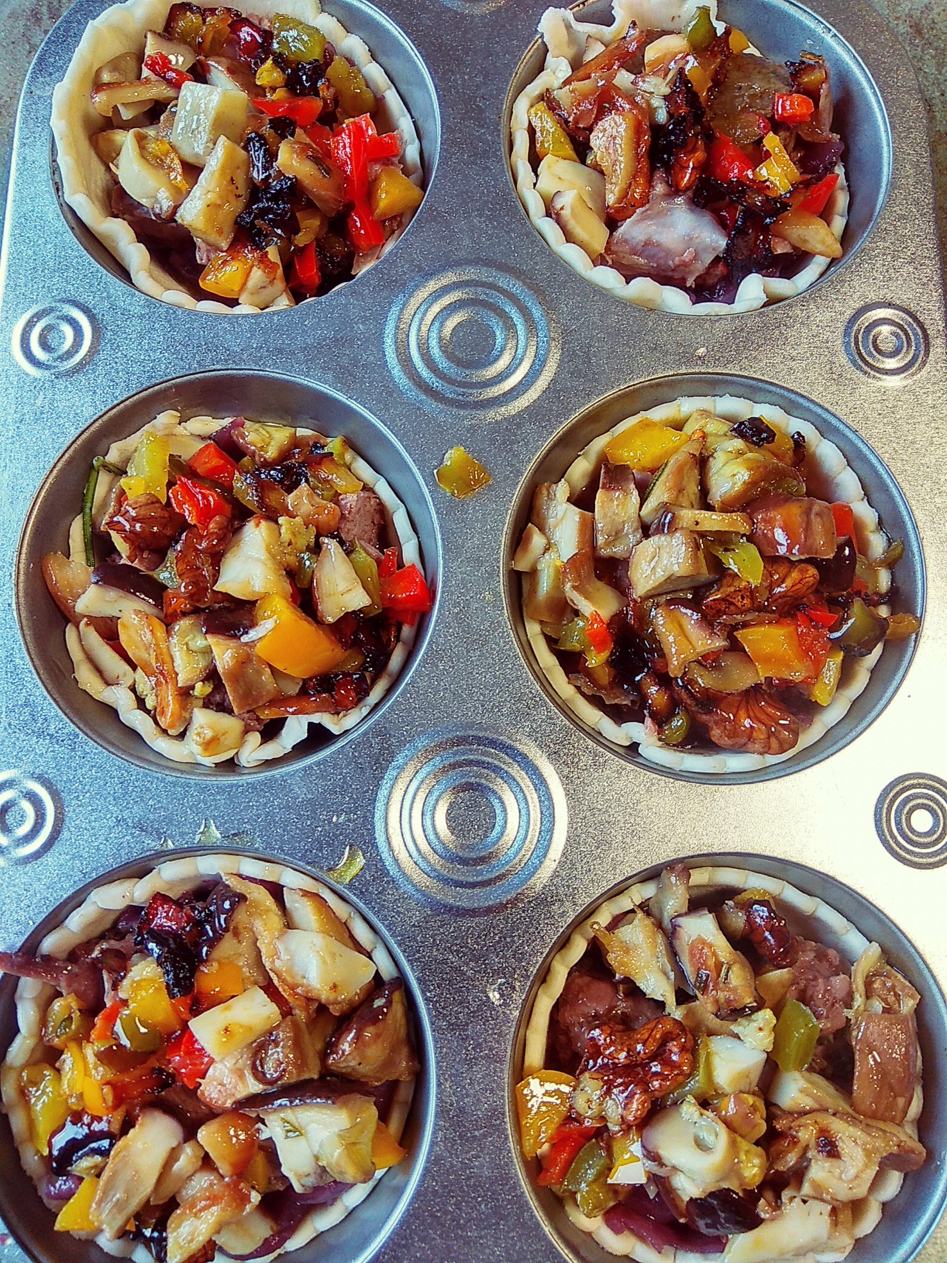 Tenemos nuestra masa de hojaldre preparada para rellenar y el resto de ingredientes listos para proceder a rellenar nuestros hojaldres. Aquí me ayudé de una bandeja para hornear magdalenas, pero solo para que no perdieran la forma. Vamos poniendo un poquito de cada a nuestro gusto y tapamos. Con el hojaldre con forma de media luna, procedemos igual, solo que a este le añadí un poco de la lombarda que me sobró, con algo de miedo por si el «aprovechamiento» me salía caro… Pero no, le dió un toque muy especial o en casa son muy agradecidos con eso de las cosas de comer, todo puede ser.