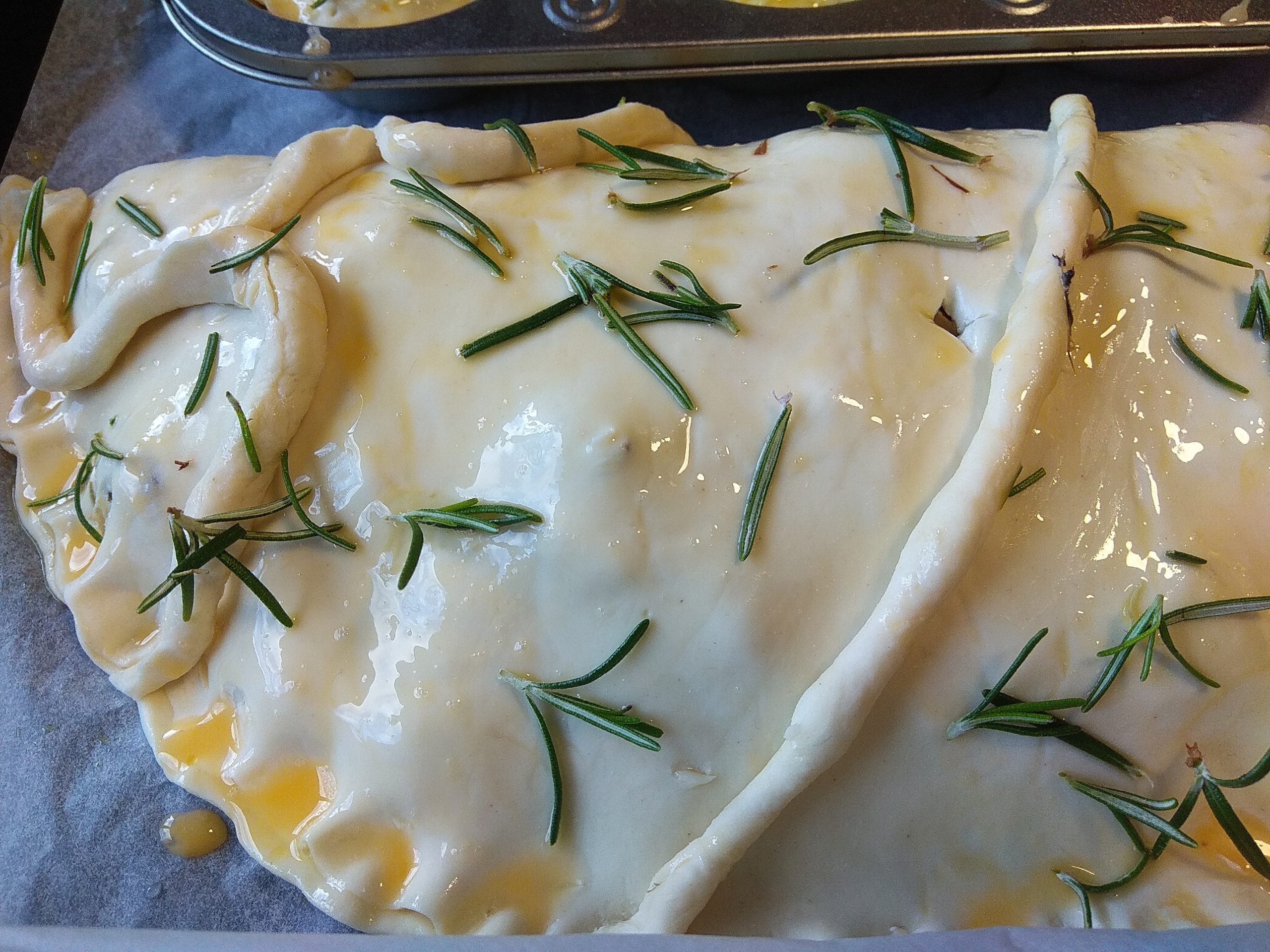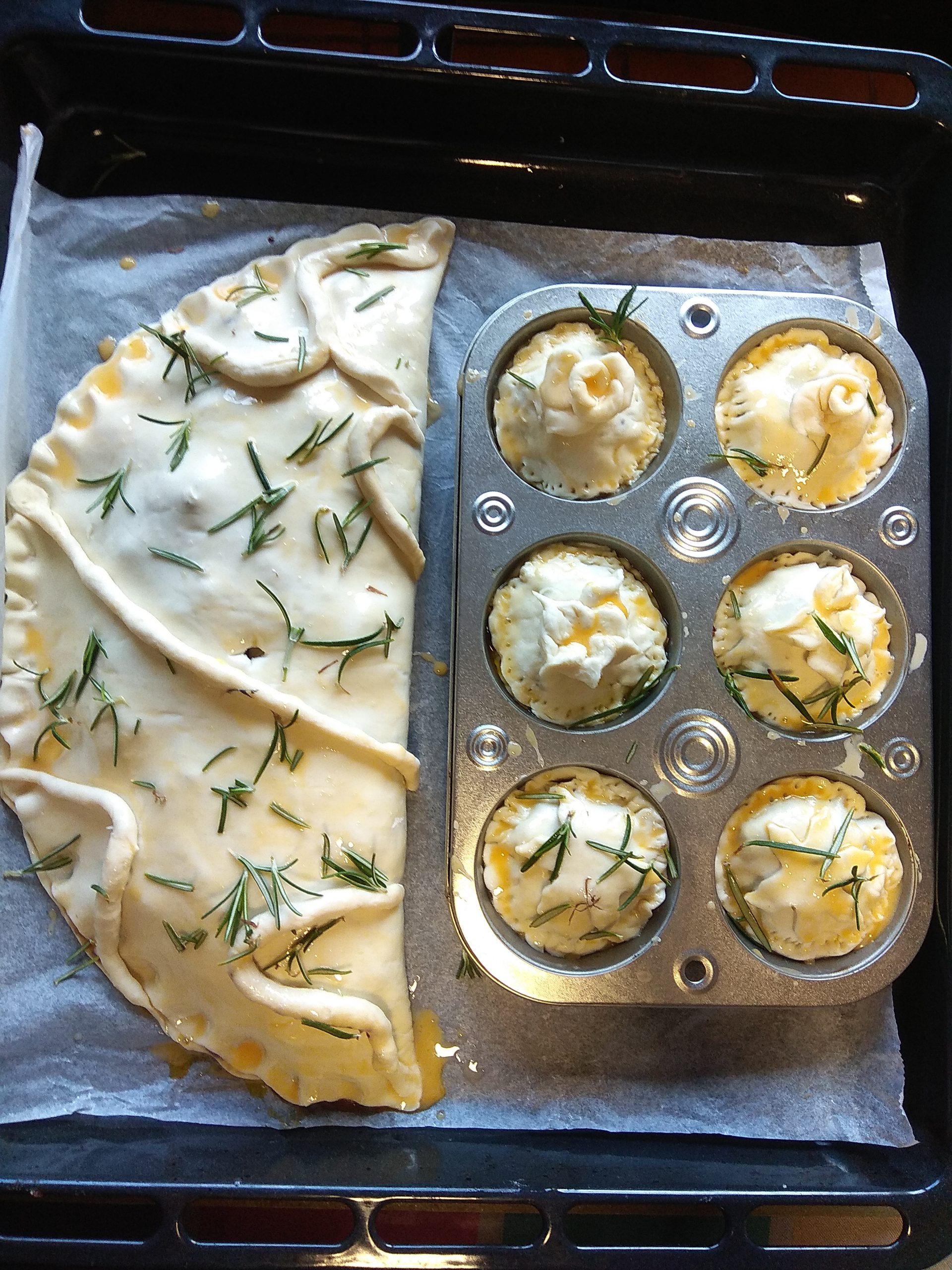 Como ya tenemos todos los hojaldres rellenos y tapados, les untamos con un huevo bien batido y unas hojas de romero. ( Si ya lo sé, abuso del romero, pero le tengo en casa, no puede ser más natural y le da un toque a todo de vicio) Con el horno precalentado a 180/200 grados ( diez minutos antes) Dejamos nuestros hojaldres unos 20 0 25 minutos. Depende de cada horno.
