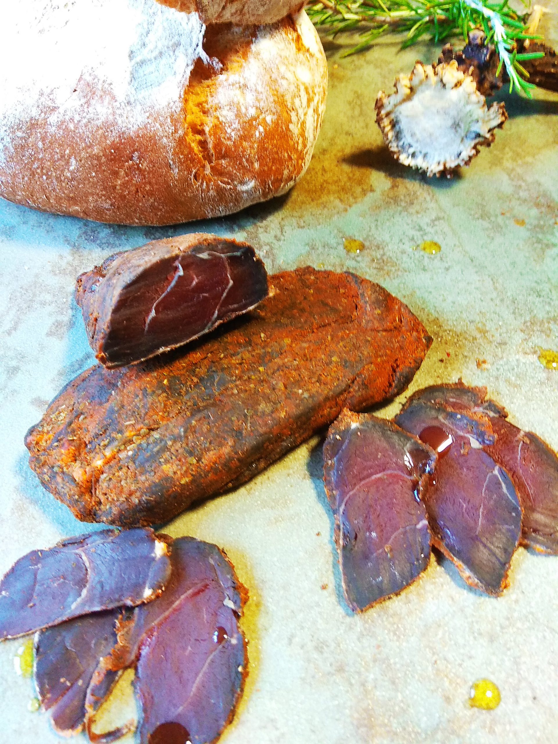 Tan básica como deliciosa, Cecina de corzo, curada en la nevera, pan y vino que es con lo que se anda el camino.