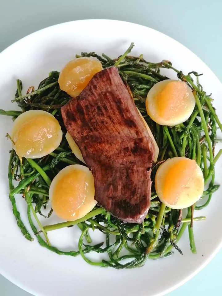 Nido de espárragos trigueros silvestres con patatas da Veiga y filete de corzo en salsa de compota de manzana con miel del Xurés