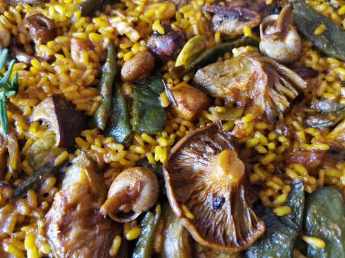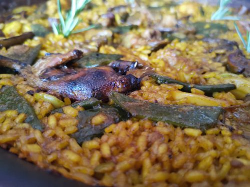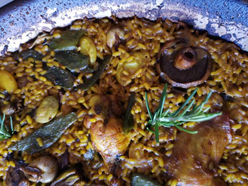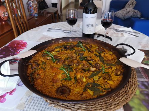 Paella de zorzales, setas de cardo, rebollones, etc. Acompañado por un vino valenciano.