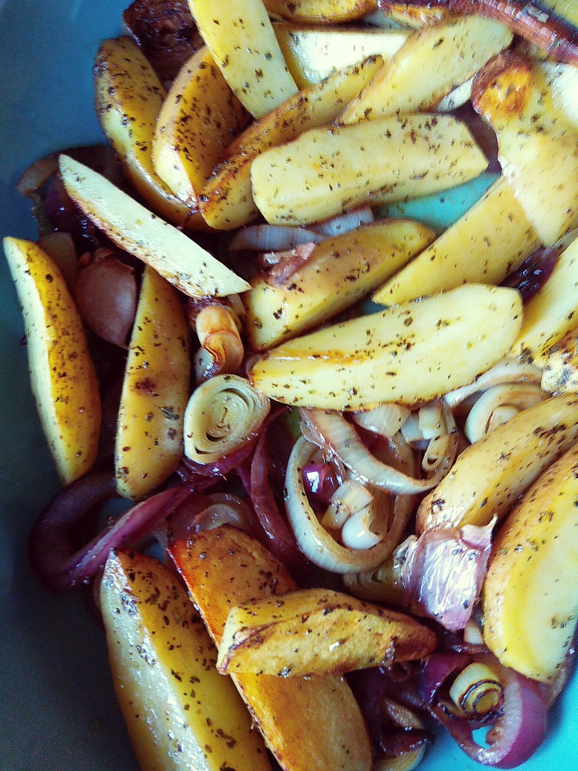 En una sartén doramos unas patatas en forma de media luna, junto a los dientes de ajo, que hemos tenido con el corzo, cuando están casi hechas, las sacamos a un papel absorbente, freímos la cebolla en aros, el puerro y reservamos.