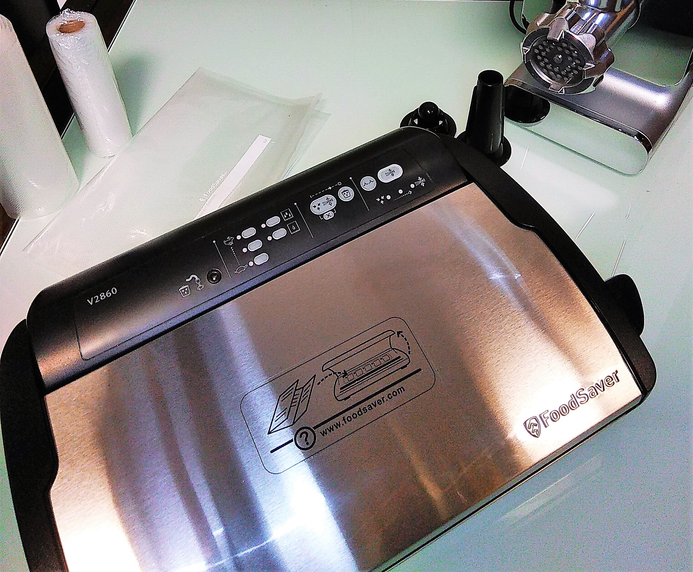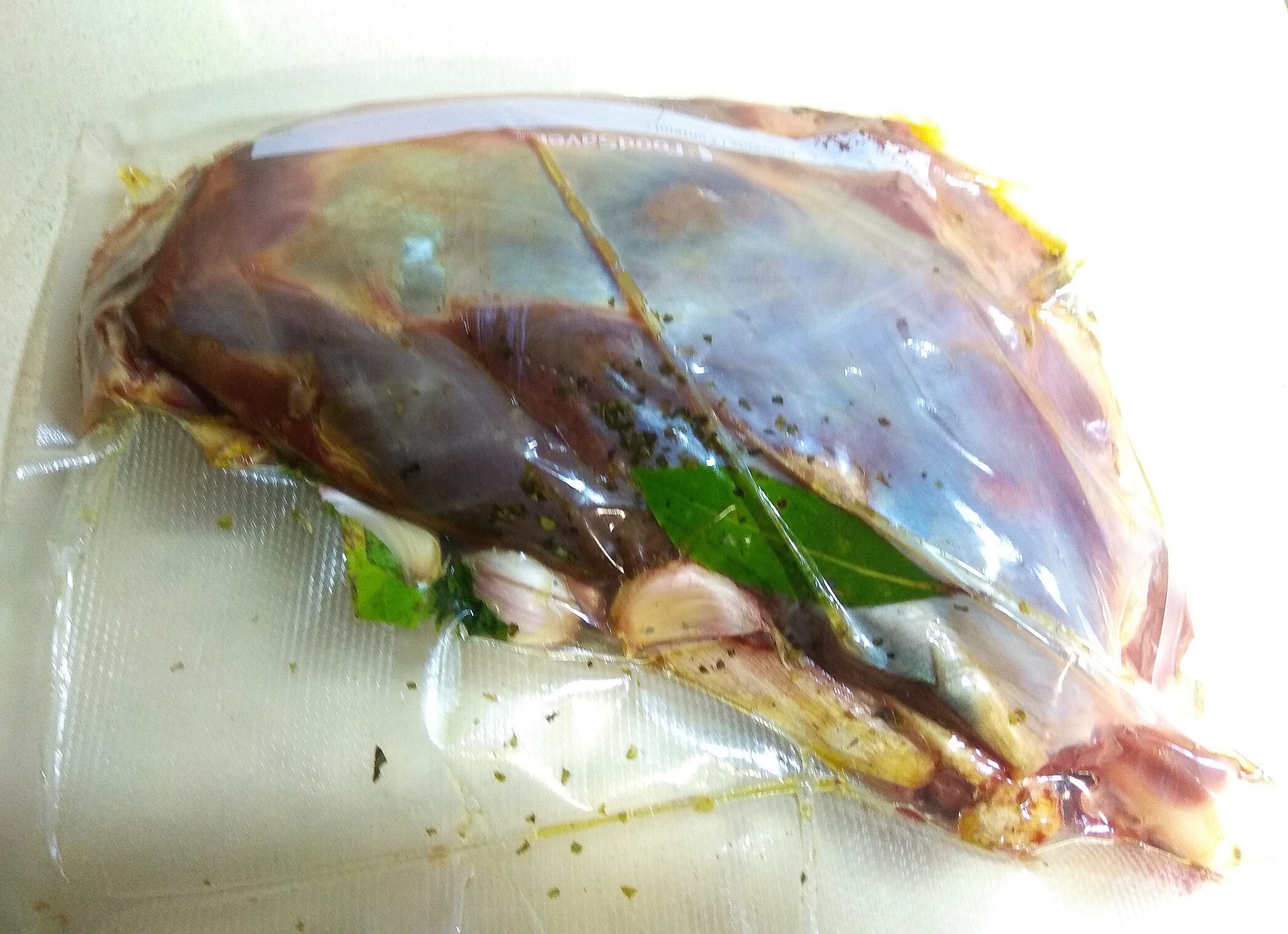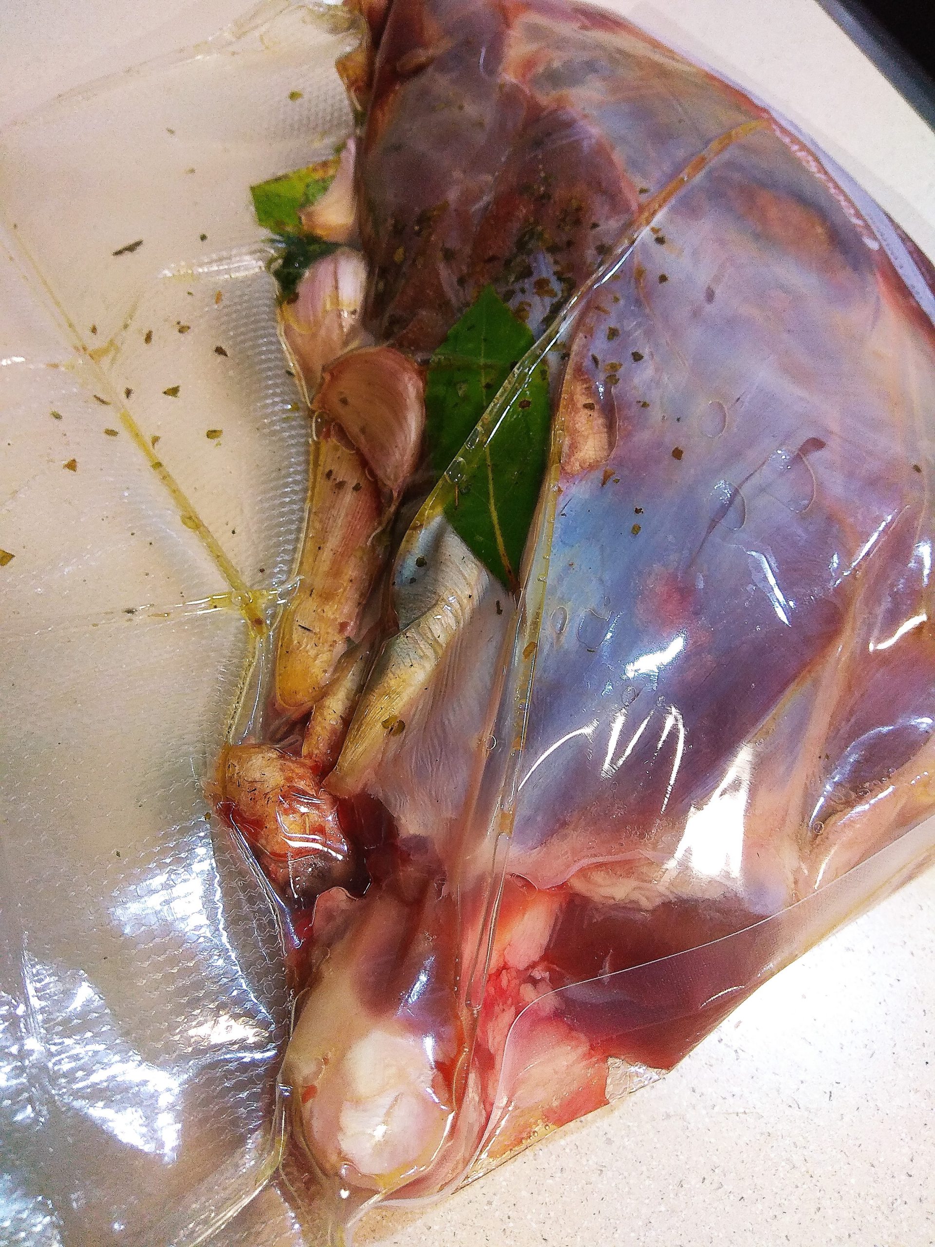 Limpiamos bien como siempre nuestra paletilla de corzo, de telillas y grasillas. Esta vez no vamos a utilizar ningún vino para marinar la carne. Cortamos por la junta del hueso y separamos el jarrete del resto de la paletilla para que en la bolsa no nos ocupe tanto especio. Salpimentamos bien la paletilla, la introducimos en una bolsa específica para cocinar al vacío, bolsa grofada ( no te vale para cocinar las bolsas normales para envasar al vacío), añadimos los dientes de ajo sin pelar, en camisa, un para de hojas de laurel, una ramita de romero y un buen chorro de aceite de oliva. En este caso utilicé un aceite de oliva variedad arbequina.