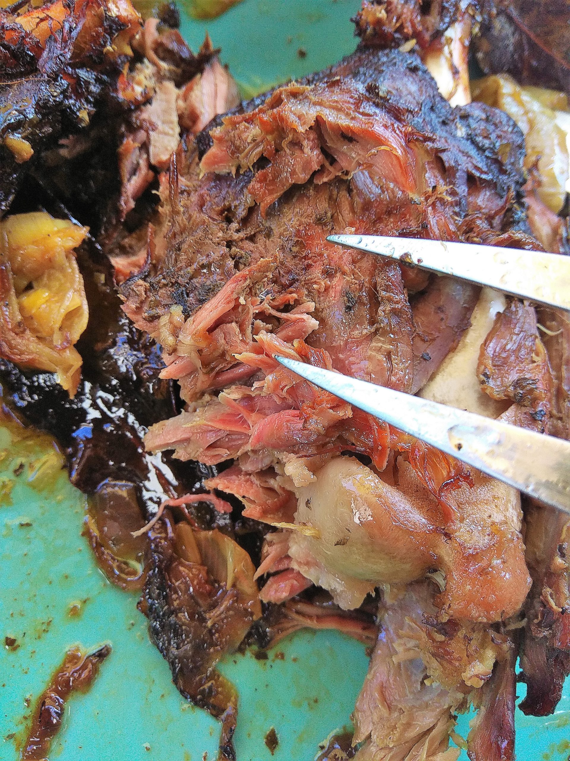 Ponemos nuestra maquinita a funcionar, amarrándola bien al recipiente que habremos llenado de agua caliente, aquí pagué la novatada, y tuve que cambiar a un recipiente mayor, dado que aunque se cocina a baja temperatura, esta se evapora y me volví loca porque la maquinita pitaba y no daba con el detalle. Así que ya sabes, ponla en un recipiente grande. La paletilla la tuve 24 horas a 70 grados.