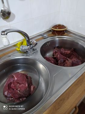 Antes de empezar, descongelamos la carne de jabalí que tenemos al aguardo en el congelador. Siempre en la nevera. Nuestro compañero nos enseña los momentos de las dos tandas de carne sin su envoltorio y ya descongeladas. Lavaremos las tripas y dejaremos escurrir hasta el momento en que nos hagan falta.