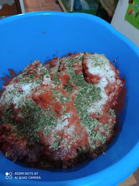 Se pica toda la carne junto a la cantidad de tocino que precise la mezcla, se añade la cantidad de ajo, sal, pimentón, orégano, perejil y pimienta negra, se amasa para que toda la carne quede bien adobada.