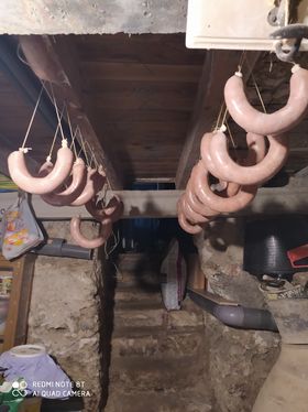 Se deja la mezcla reposar unas horas y se procede al embuchado de los chorizos, ayudándonos de nuestra máquina picadora de carne y de un pelín de paciencia. Se rellenan las herraduras, se atan, (se pincha con un alfiler la tripa para que no quede aire) y se cuelgan en un sitio seco y fresco. Toca esperar a que sequen y si hay mucho antojo a los días ya se pueden consumir en fresco pasados por la sartén.