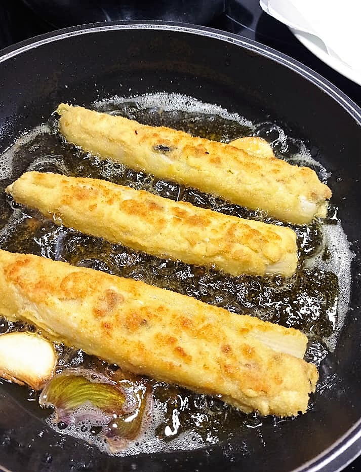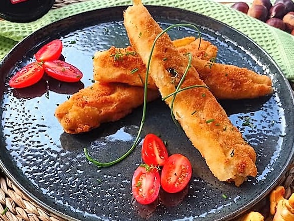 Espárragos rellenos con rebozuelos y nueces, rebozados con harina de castaña