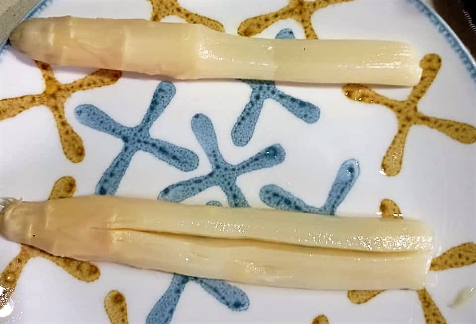Escurrimos los espárragos (mejor si son gorditos) cortamos a la mitad, procurando no dañar las yemas.