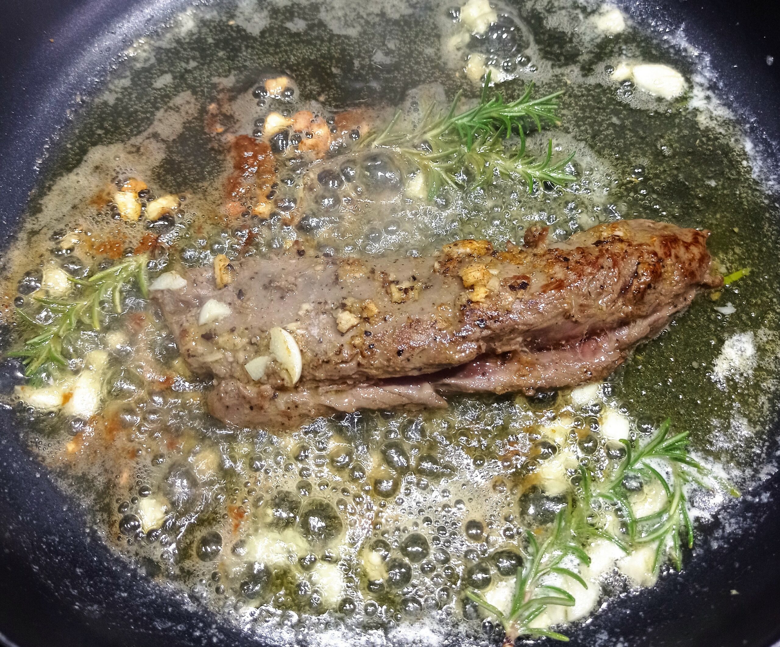 En una sartén, ponemos un poco de mantequilla y un chorrito de aceite de oliva, para que no se nos queme la mantequilla, cuando esté al punto, colocamos nuestro solomillo y vamos bañando, el solomillo, ayudados de una cuchara , añadimos una ramita de romero, y dejamos según nuestro gusto, el punto de la carne. Esta la dejé unos tres minutos de cada lado. Sacamos a un plato y dejamos reposar la carne antes de trincharla. Tiempo que aprovechamos para marcar los boletus. Sartén caliente y cucharada de aceite de oliva, en cuanto esté caliente la sartén echamos las setas y salteamos unos minutos, añadimos al gusto un toque de pimienta negra y orégano seco (opcional) Si te gusta, puedes añadir la punta de una guindilla o cayena a la sartén antes de saltear las setas.