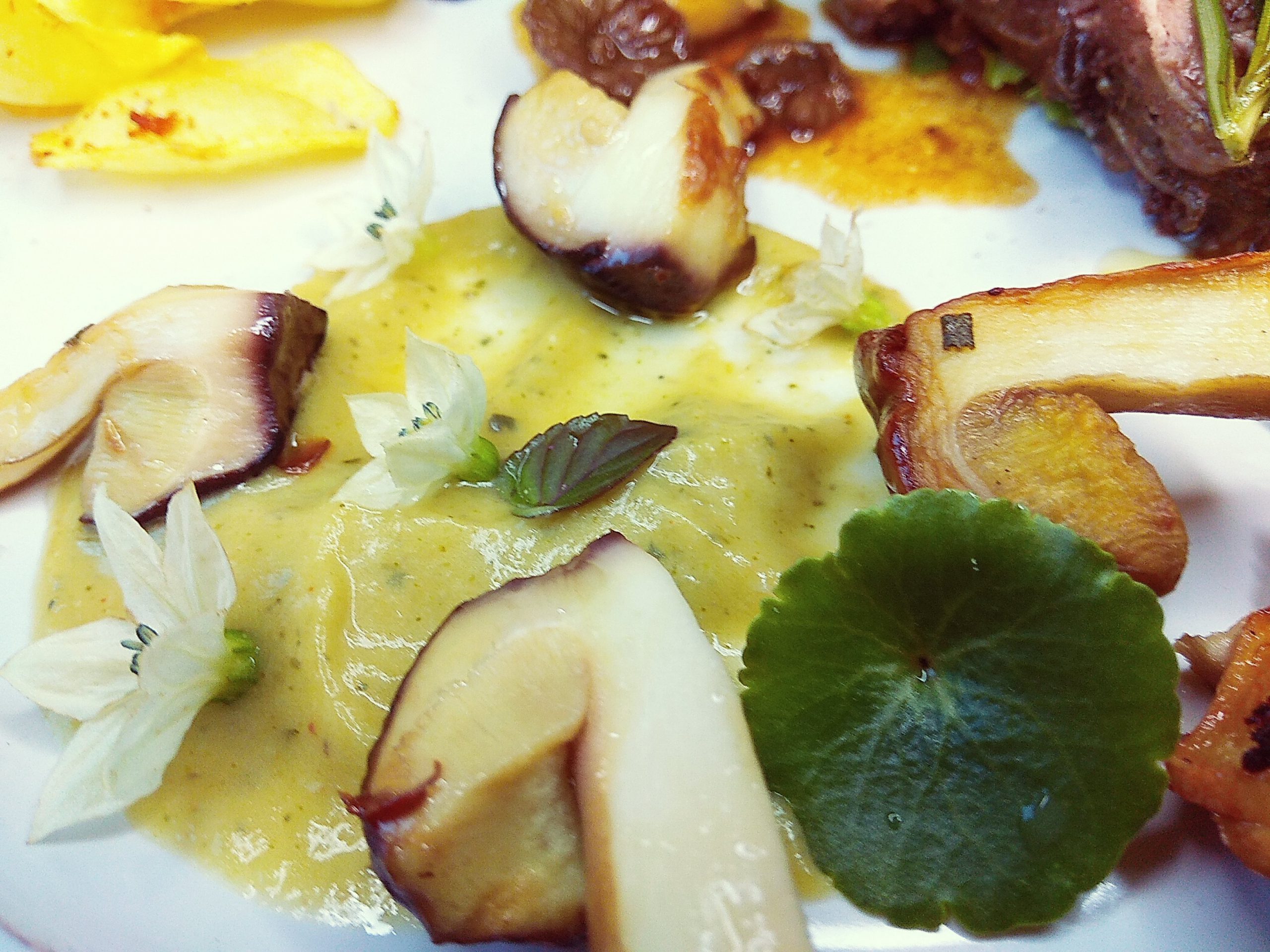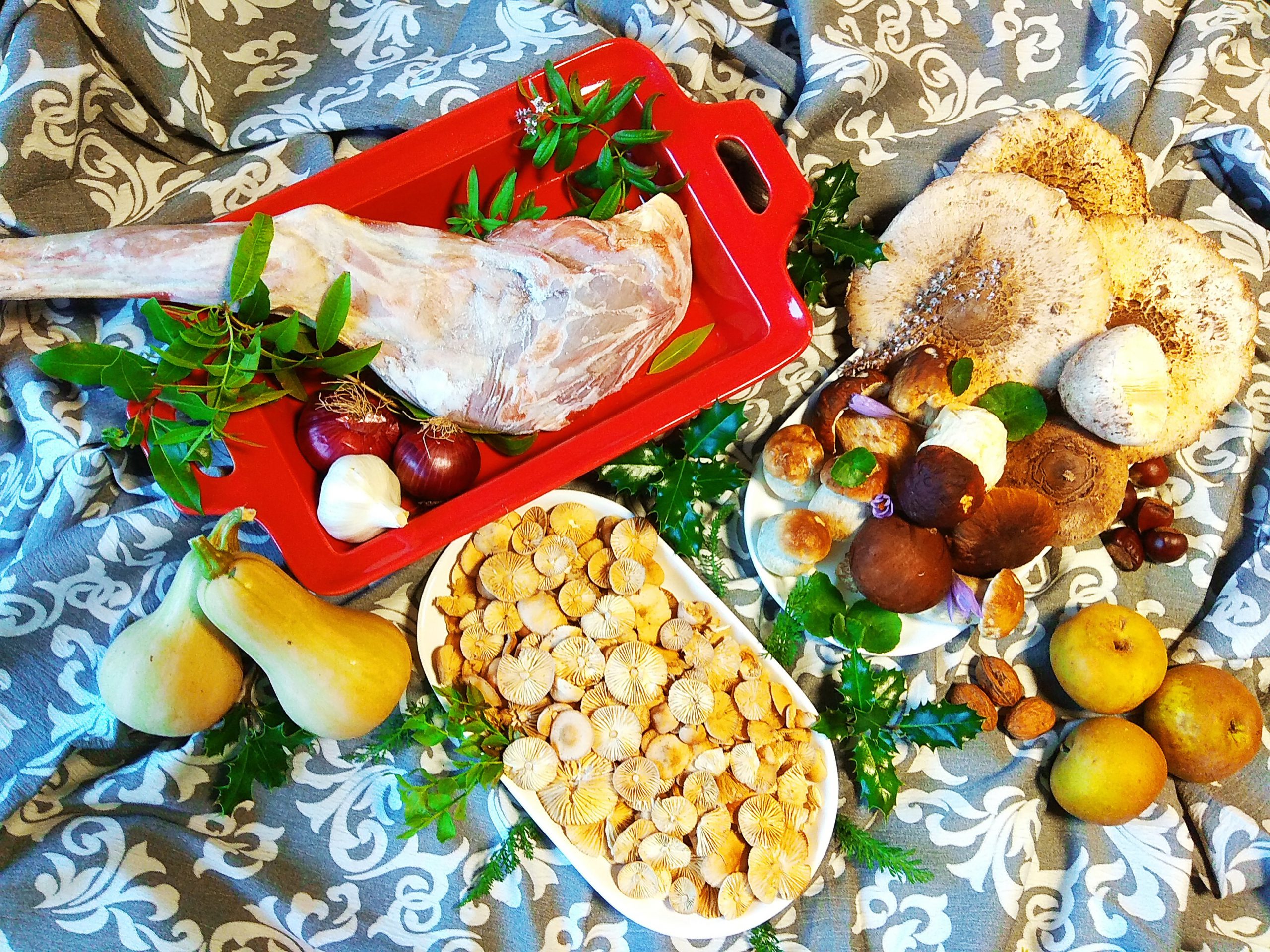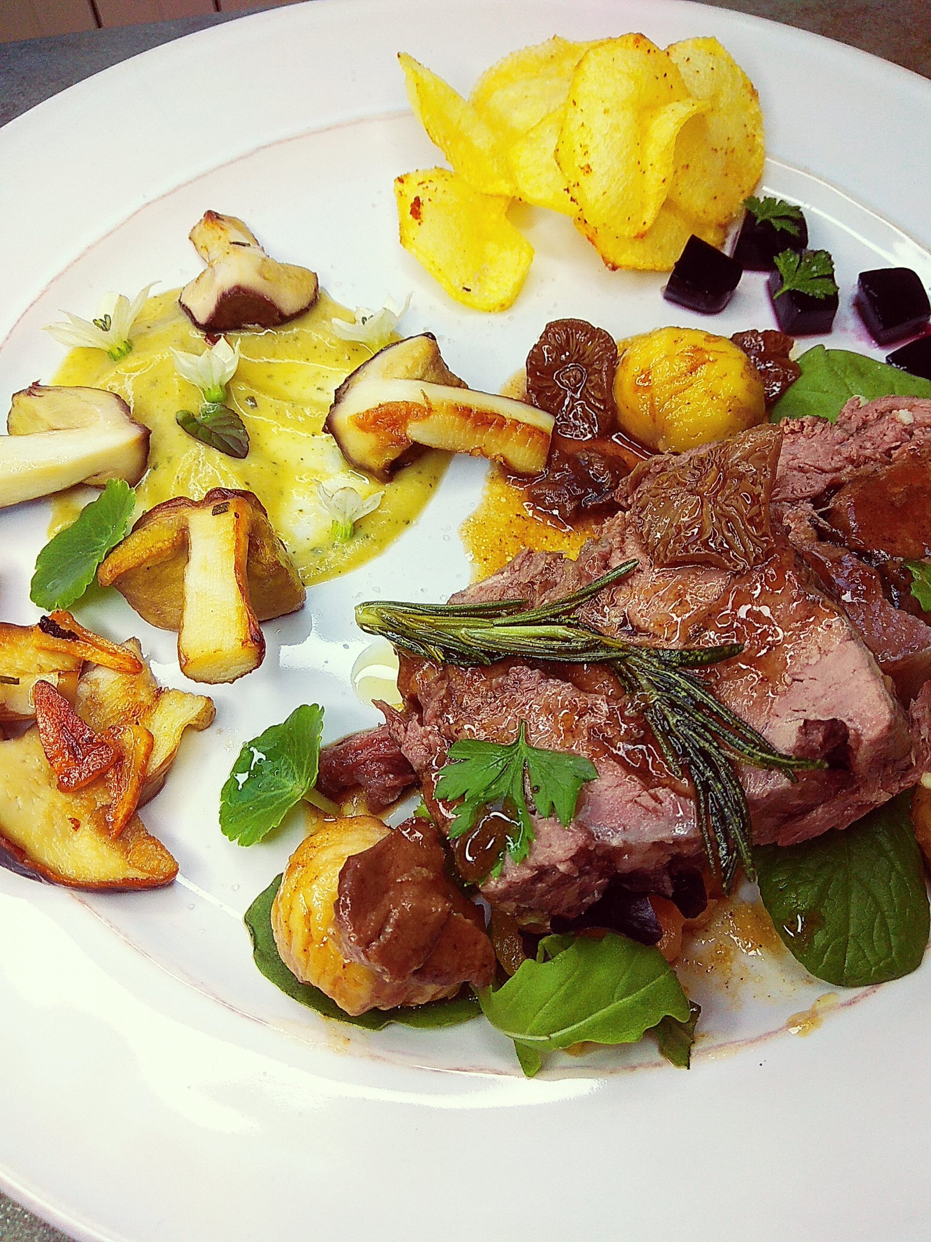 Esta es mi propuesta, recuerda que solo soy cocinillas, jijii. En el plato, ponemos una cucharada de compota y con el fondo de una taza, posamos para que nos quede esa forma tan chula, ponemos tres medias lunas de calabaza, las dos lonchas de la terrina de corzo, las patatas fritas, los cuadraditos de nuestra gelatina de saúco, unas castañas y senderuelas por plato, salseamos, colocamos los Boletus recién sacados de la sartén y decoramos con la ramita de romero frita y hojitas de ensalada, hierbas ( perifollo, perejil, ombligos de venus Umbilicus rupestris lo que tengas o más te guste) y o florecillas comestibles.