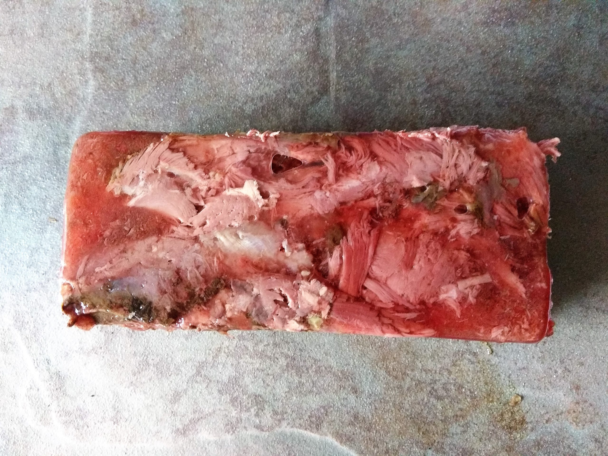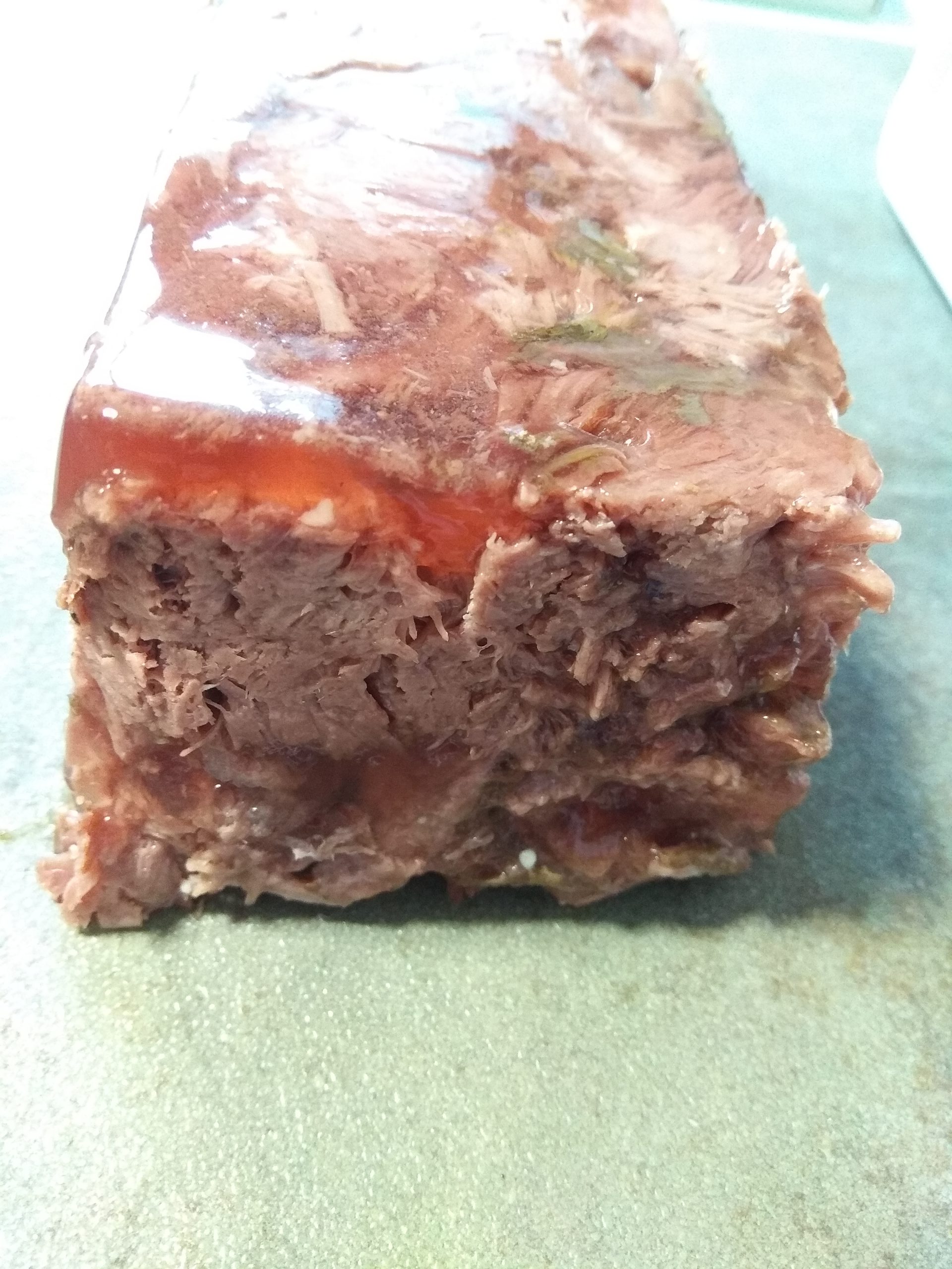 Preparamos un molde tipo paté o cup cake, si no es desmontable o de silicona, pon un poco de papel film bien colocado en el fondo, para que después al desmoldar sea más fácil. Reservamos el jarrete, para otro momento, quitamos los huesos, verás que salen solos. y vamos colocando en nuestro molde los trozos de carne, procurando colocarles bien para que no quede ningún hueco. Una vez finalizado, tapamos el molde con papel film y en cuanto esté frío metemos a la nevera poniendo un brick o dos de leche para que nos haga peso y se prense bien.