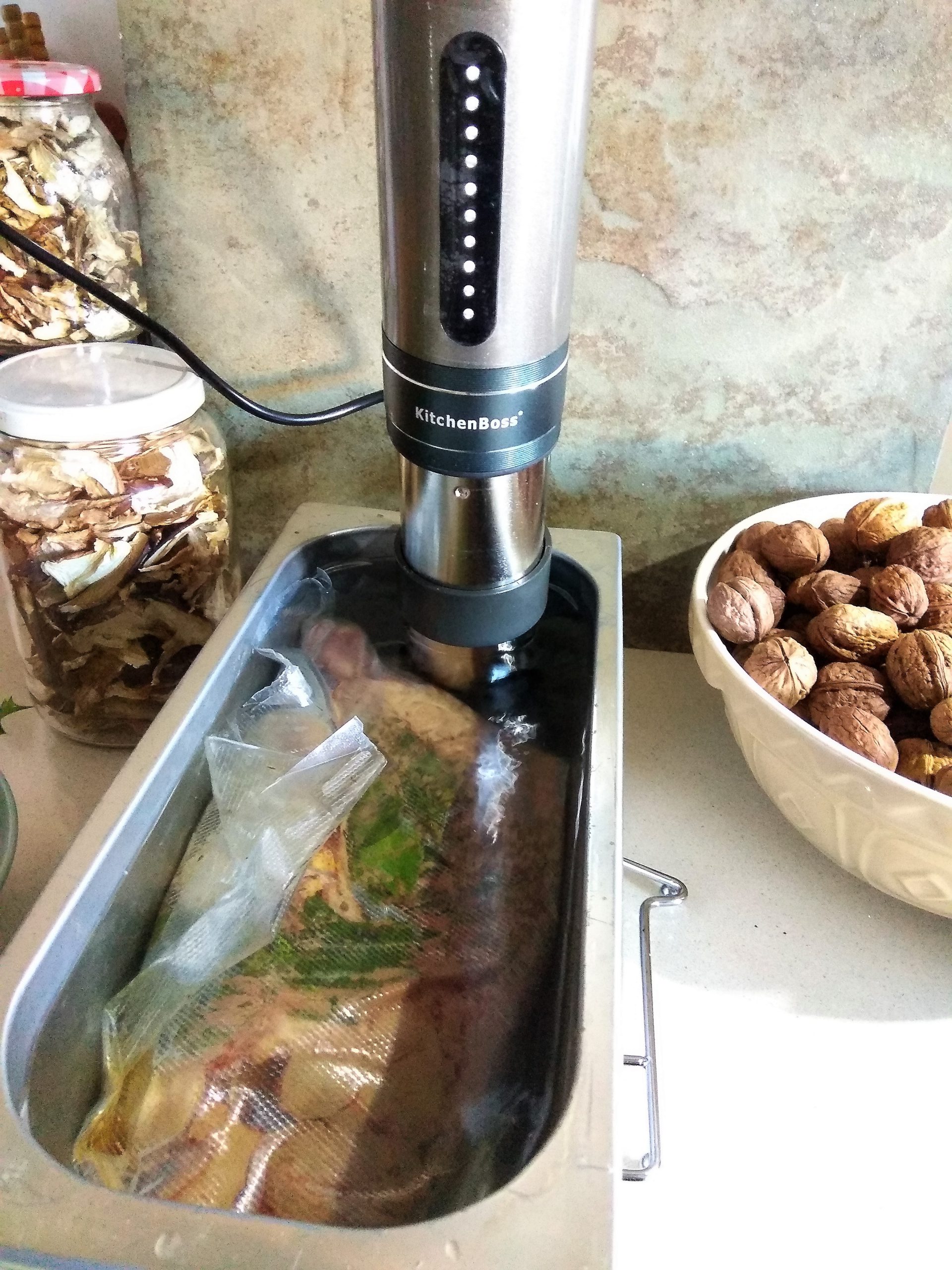 Prepara una cazuela grande o recipiente hondo dónde puedas sujetar la máquina, llenas de agua ( del grifo y caliente, nos ahorramos tener que esperar a que el electrodoméstico la caliente.) Sujetas con la pinza que trae la máquina y eliges la temperatura, yo puse 60ºC. A las horas de la foto, tuve que cambiar por una cazuela ( la más grande que tengo) el recipiente que utilicé se quedaba pequeño y la máquina empezó a pitar ( por la evaporación faltaba agua)